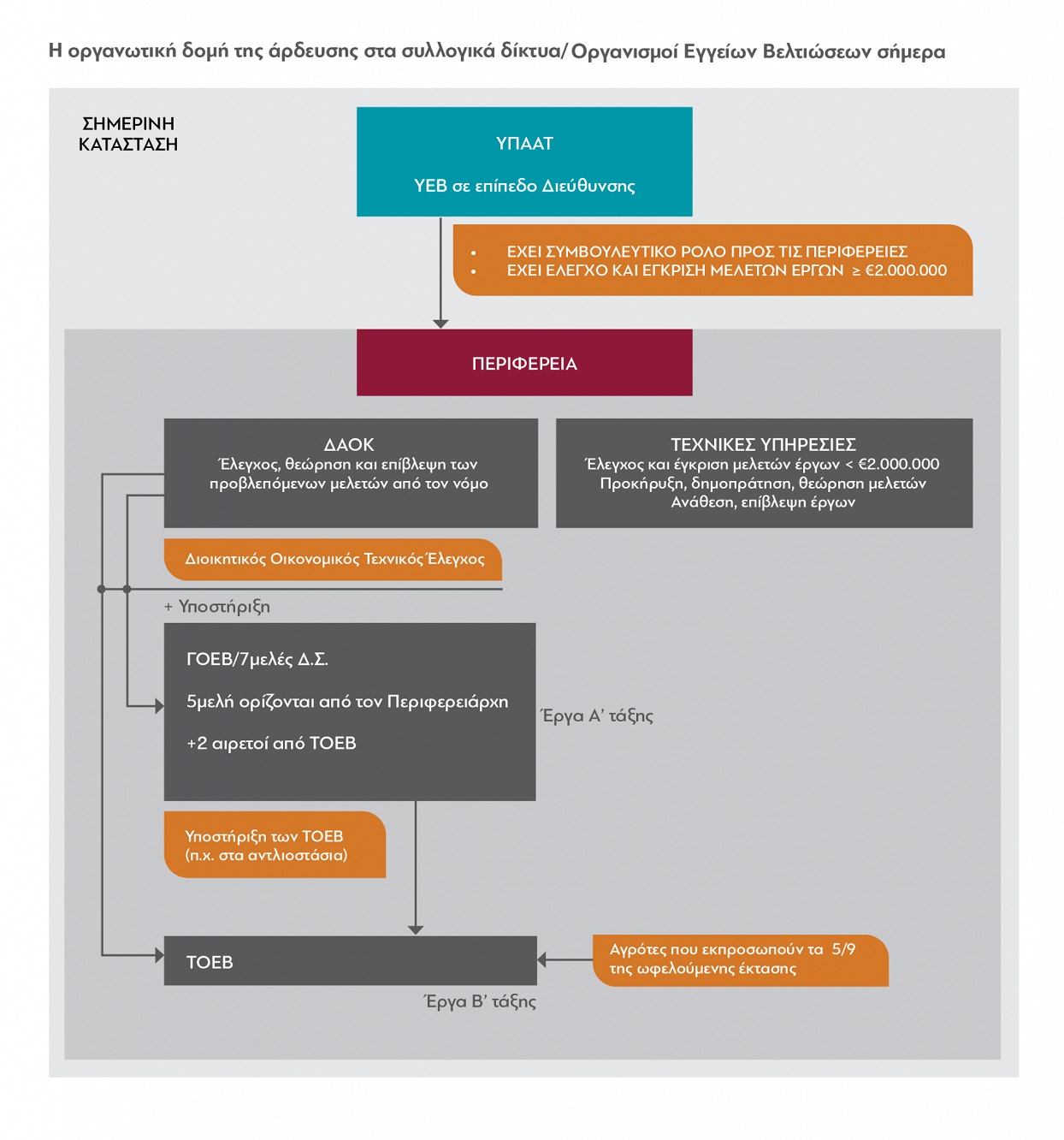 Η ίδρυση των ΤΟΕΒ και ΓΟΕΒ, ήδη από τη δεκαετία του 1950, επέτρεψε στους Έλληνες αγρότες να αυξήσουν την παραγωγή τους, χρησιμοποιώντας νέες αρδευτικές μεθόδους για τα δεδομένα της εποχής. Για τα έργα αυτά έχουν επενδυθεί άλλωστε πολύ σημαντικοί δημόσιοι και ιδιωτικοί πόροι. Μαζί με την ίδρυση των ΤΟΕΒ ιδρύθηκε και η Υπηρεσία Εγγείων Βελτιώσεων (ΥΕΒ) η οποία είχε την αρμοδιότητα να ελέγχει και να επικουρεί τους ΟΕΒ, με ειδικό επιστημονικό προσωπικό και με εξοπλισμό. Ωστόσο, μετά από πολλές αλλαγές στο θεσμικό πλαίσιο, η ΥΕΒ αποδυναμώθηκε και έχασε μεγάλο μέρος τους προσωπικού και του εξοπλισμού της. Με τον "Καλλικράτη" η αρμοδιότητα των ΤΟΕΒ είχε μεταφερθεί στους ΟΤΑ. Σήμερα, η αρμοδιότητα των ΟΕΒ έχει μεταφερθεί στις αντίστοιχες Περιφέρειες, οι οποίες όμως δεν διαθέτουν μια αντίστοιχη υποδομή, προκειμένου να υποστηρίξουν με εξοπλισμό ή επιστημονικά τους ΟΕΒ.