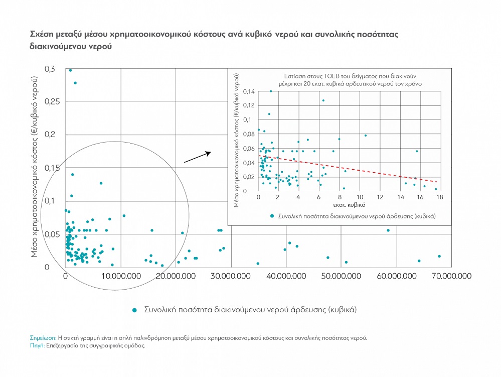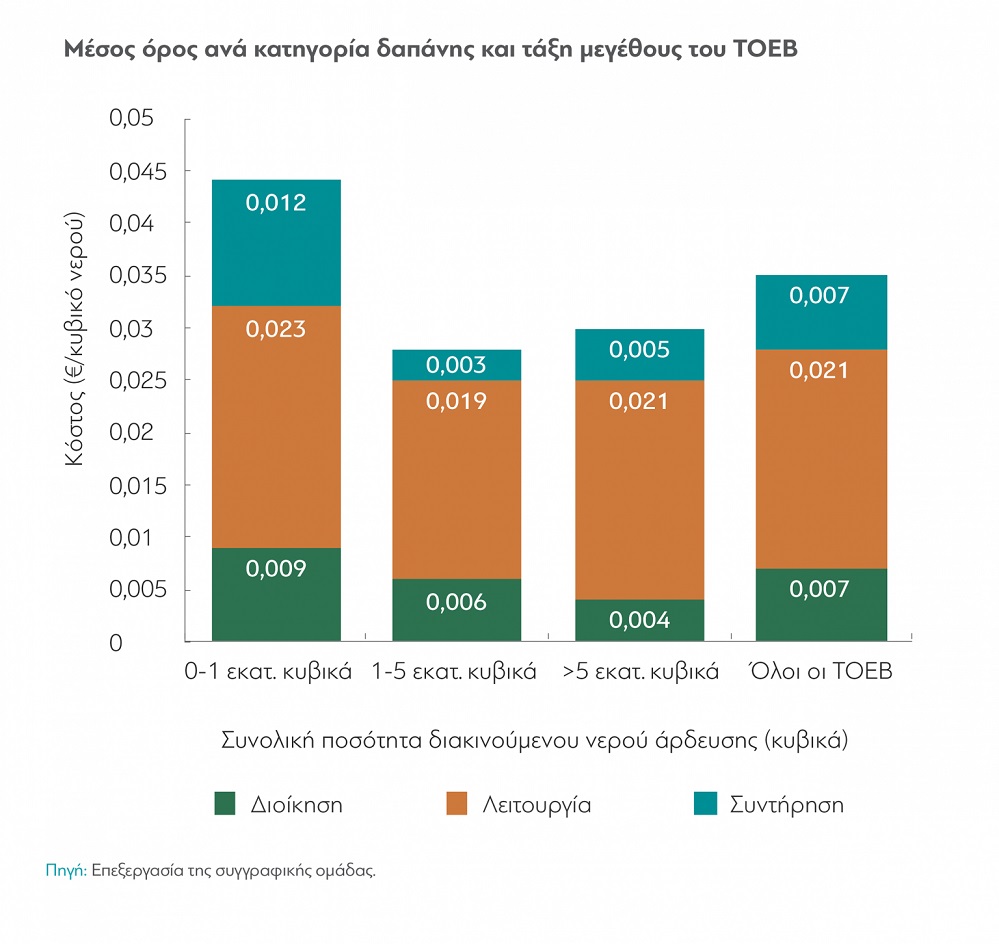 Ένα δεύτερο συμπέρασμα είναι οι σημαντικές διαφορές μεταξύ αυτών των 118 ΤΟΕΒ ως προς το μέγεθός τους, με κάθε μέτρο. Από τη σκοπιά του κόστους, η διάμεσος του χρηματοοικονομικού κόστους είναι σχεδόν 3 λεπτά το κυβικό μέτρο και ο μέσος όρος 4 λεπτά το κυβικό, όμως υπάρχουν ΤΟΕΒ που οι τιμές φτάνουν μέχρι τα 30 λεπτά ανά κυβικό. Ο μικρότερος ΤΟΕΒ έχει κόστος δυο φορές υψηλότερο της διαμέσου. Αντίστοιχες είναι και οι αυξομειώσεις στις δαπάνες λειτουργίας, συντήρησης και διοίκησης, αν και τα αντίστοιχα δεδομένα υπάρχουν για ακόμα λιγότερους ΤΟΕΒ, μόνο 74. Οι διαφορές στα κόστη συντήρησης είναι ενδεικτικές. "Οι μεγάλες διαφορές εντοπίζονται στους πολύ μικρούς (αλλά και πολυάριθμους) ΤΟΕΒ οι οποίοι διακινούν λιγότερο από 1 εκατομμύριο κυβικά μέτρα νερού", γράφουν οι ερευνητές. "Το μέσο κόστος συντήρησης μεταξύ των ΤΟΕΒ που διακινούν μέχρι και 1 εκατομμύριο κυβικά μέτρα είναι σχεδόν 5 φορές υψηλότερο από τους ΤΟΕΒ που διακινούν 1-5 εκατομμύρια κυβικά".