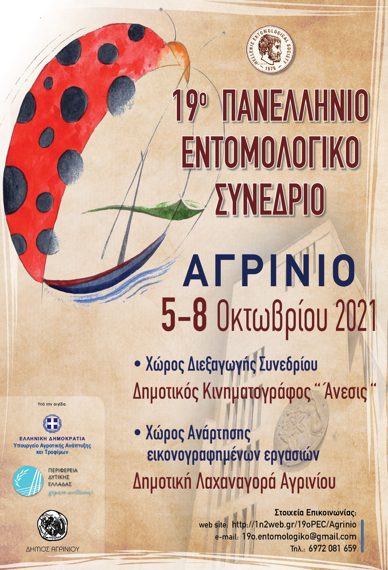 Η Οργανωτική Επιτροπή του 19ου Πανελλήνιου Εντομολογικού Συνεδρίου και η Εντομολογική Εταιρεία Ελλάδος, ανακοινώνουν ότι οι εργασίες του 19ου Πανελλήνιου Εντομολογικού Συνεδρίου θα πραγματοποιηθούν 5 με 8 Οκτωβρίου 2021 στο Αγρίνιο, της Π.Ε. Αιτωλοακαρνανίας, Περιφέρεια Δυτικής Ελλάδος.