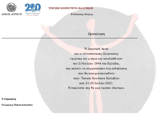 Ο Δήμος Αγρινίου, η Περιφέρεια Δυτικής Ελλάδας και οι Αντιστασιακές Οργανώσεις τιμώντας τη μνήμη των 59 εκτελεσθέντων πατριωτών της Γερμανικής Κατοχής στη σιδηροδρομική γραμμή Αγρινίου-Κρυονερίου, την 31η Ιουλίου 1944, διοργανώνουν μια σειρά εκδηλώσεων που θα πραγματοποιηθούν στην Τοπική Κοινότητα Καλυβίων από 21-25 Ιουλίου 2021. Δείτε το πρόγραμμα των εκδηλώσεων: