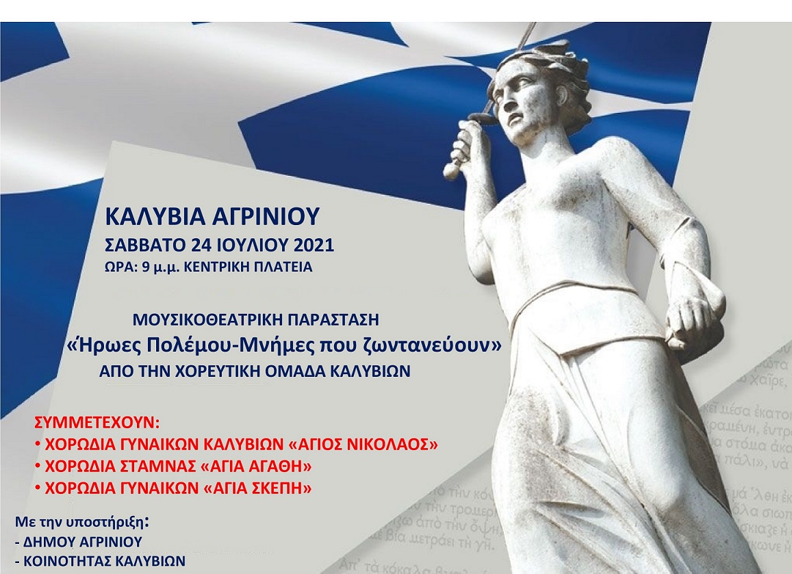 To Σάββατο 24 Ιουλίου στις 9 το βράδυ, θα πραγματοποιηθεί η μουσικοθεατρική παράσταση με τίτλο «Ήρωες Πολέμου-Μνήμες που ζωντανεύουν», από τη Χορευτική Ομάδα Καλυβίων «Άγιος Νικόλαος», στην κεντρική πλατεία Καλυβίων.
