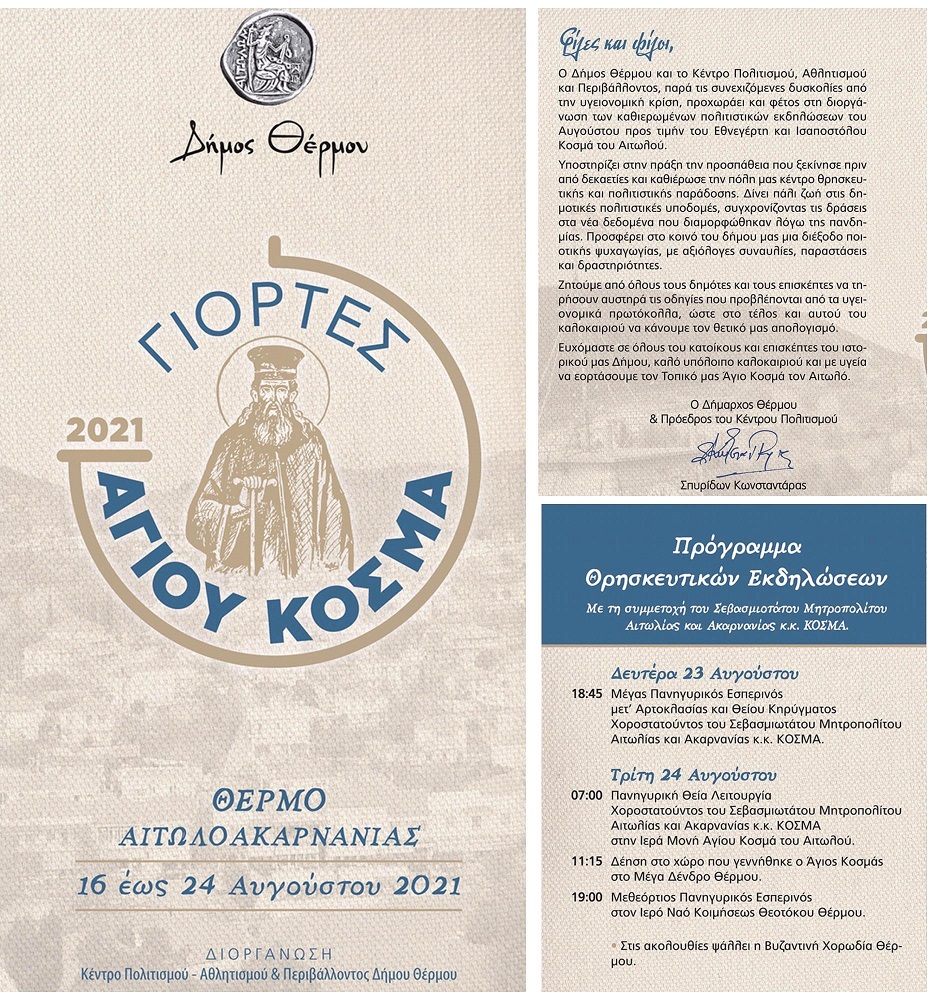 «O Δήμος Θέρμου και το Κέντρο Πολιτισμού, Αθλητισμού και Περιβάλλοντος, παρά τις συνεχιζόμενες δυσκολίες από την υγειονομική κρίση, προχωράει και φέτος στη διοργάνωση των καθιερωμένων πολιτιστικών εκδηλώσεων του Αυγούστου προς τιμήν του Εθνεγέρτη και Ισαποστόλου, Κοσμά του Αιτωλού.