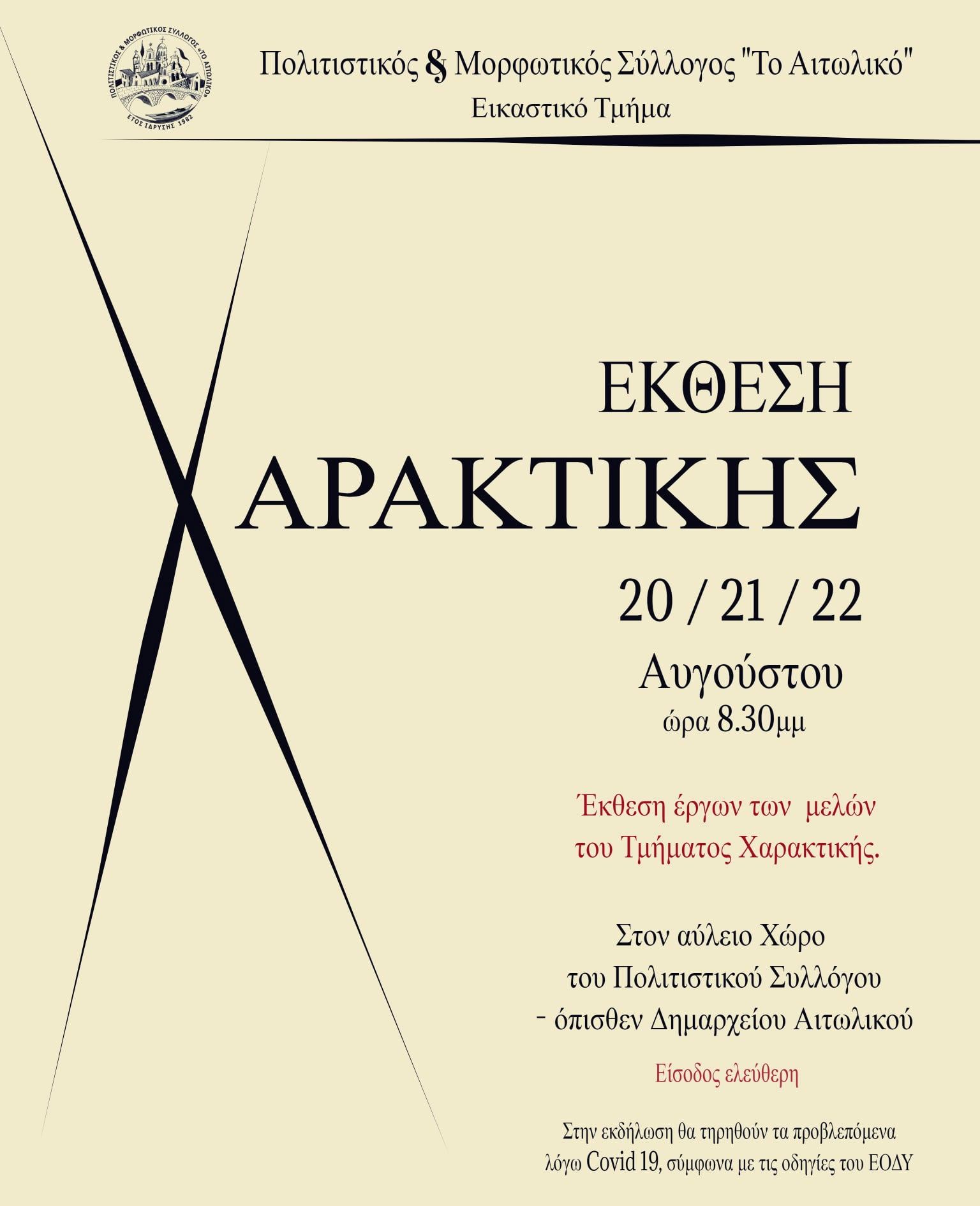 Η 4η Έκθεση έργων Χαρακτικής των μελών του Τμήματος Χαρακτικής του Πολιτιστικού & Μορφωτικού Συλλόγου "Το Αιτωλικό" θα πραγματοποιηθεί στις 20, 21 και 22 Αυγούστου 2021, στον αύλειο χώρο του κτιρίου του συλλόγου, στην Κεντρική Πλατεία Αιτωλικού.