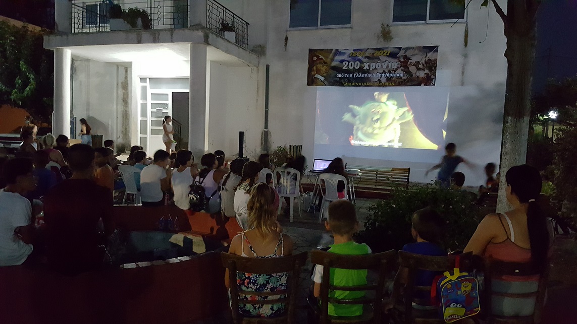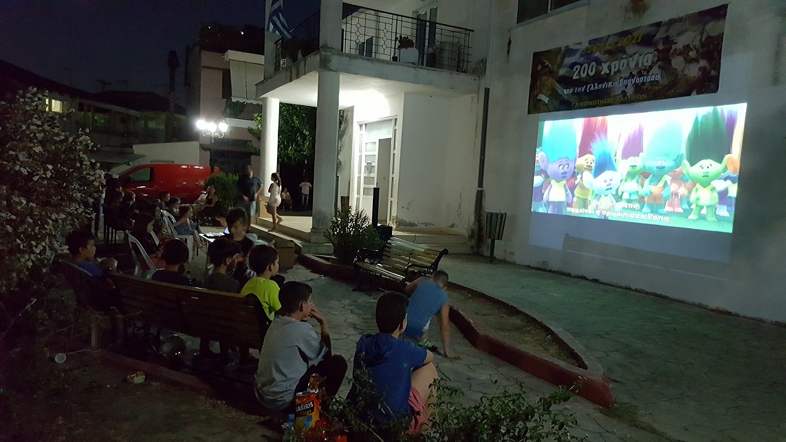 Μία πολύ ωραία εκδήλωση πραγματοποιήθηκε απόψε στην κεντρική πλατεία του χωριού μας, με την προβολή ταινίας κινουμένων σχεδίων για μικρά παιδιά, προβολή που οργανώθηκε από τον Κοινότητα Καλυβίων.