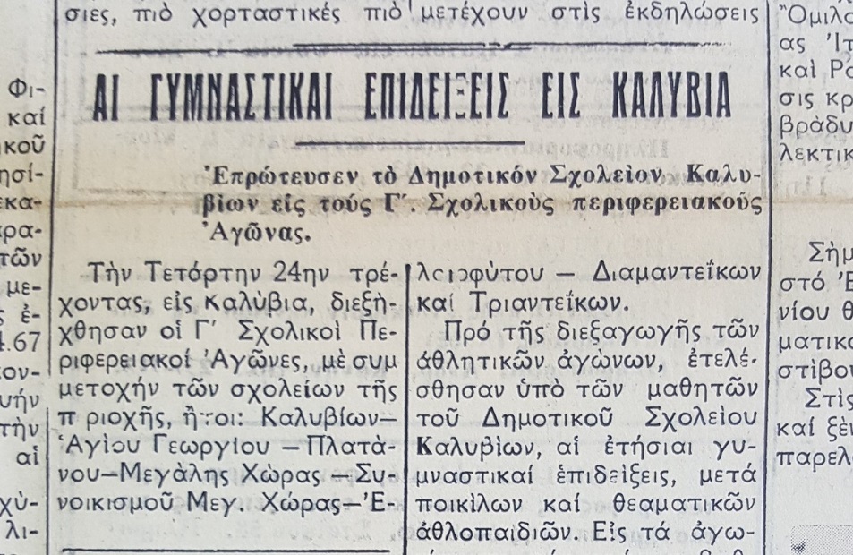 Τήν Τετάρτην 24ην τρέχοντος, είς Καλύβια, διεξήχθησαν οι Γ' Σχολικοί Περιφερειακοί Άγώνες, μέ συμμετοχήν των σχολείων της περιοχής, ήτοι: Καλυβίων, Αγίου Γεωργίου, Πλατάνου, Μεγάλης , Χώρας, συνοικισμού Μεγ. Χώρας, Έλαιοφύτου, Διαμαντεΐκων καί Τριαντεΐκων.