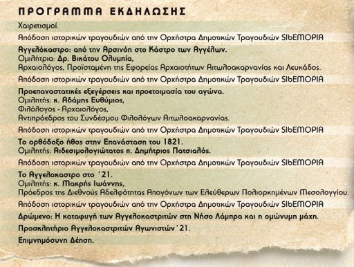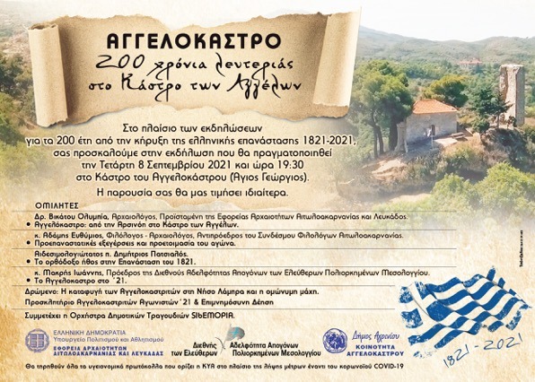 Στο πλαίσιο των εκδηλώσεων για τα 200 χρόνια από την έναρξη της Ελληνικής Επανάστασης, την Τετάρτη 8 Σεπτεμβρίου στις 19.30 μ.μ. διοργανώνεται επετειακή εκδήλωση από την Διεθνή Αδελφότητα Απογόνων των Ελεύθερων Πολιορκημένων Μεσολογγίου, την Κοινότητα Αγγελοκάστρου, την Εφορεία Αρχαιοτήτων Αιτωλοακαρνανίας & Λευκάδος και τον Δήμο Αγρινίου.