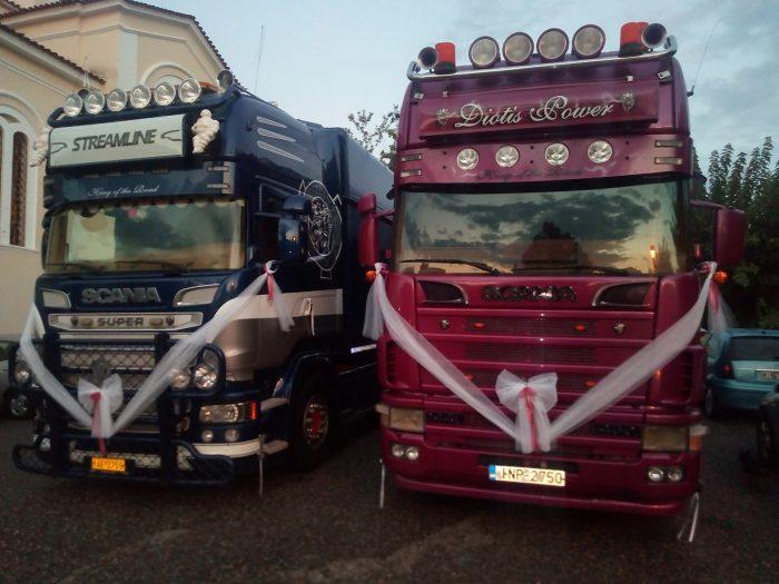 Ο γαμπρός κάτοικος Πλατάνου Καλυβίων, ο οποίος είναι ιδιοκτήτης των φορτηγών, επέλεξε αυτόν τον σπάνιο τρόπο στην πιο όμορφη στιγμή της ζωή τους, τον γάμο τους!