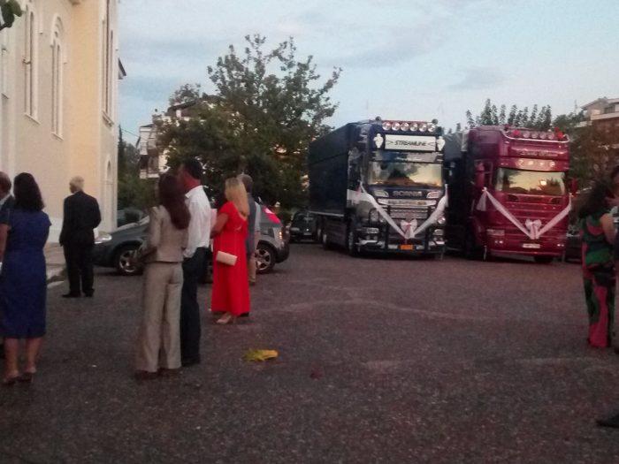 Τα στολισμένα και φωταγωγημένα φορτηγά μετέφεραν τον Χρήστο Διώτη και την αγαπημένη του Γιώτα, στην εκκλησία της Αγίας Τριάδας Αγρινίου, για τον γάμο τους. Το πρώτο φορτηγό που κατέφθασε μετέφερε τον γαμπρό, ενώ λίγα λεπτά αργότερα έφτασε και το δεύτερο φορτηγό με την νύφη.