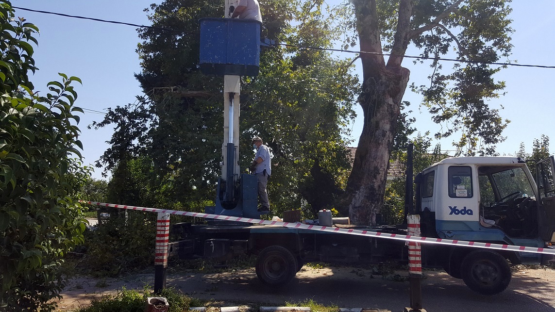 Οι σχετικές παρεμβάσεις βαθέως κλαδέματος και κοπής κορμιδίων, καθώς και η απομάκρυνσή τους, έγιναν από εργάτες, με τη χρήση ειδικού καλαθοφόρου ανυψωτικού μηχανήματος και αλυσοπρίονα, υπό την επίβλεψη Γεωπόνου του δήμου και κατόπιν σχετικής άδειας του Δασαρχείου Αγρινίου. Κατά τις εκτελούμενες εργασίες παρευρέθηκε και ο Πρόεδρος της Κοινότητας Καλυβίων, Δημήτρης Αναστασίου.