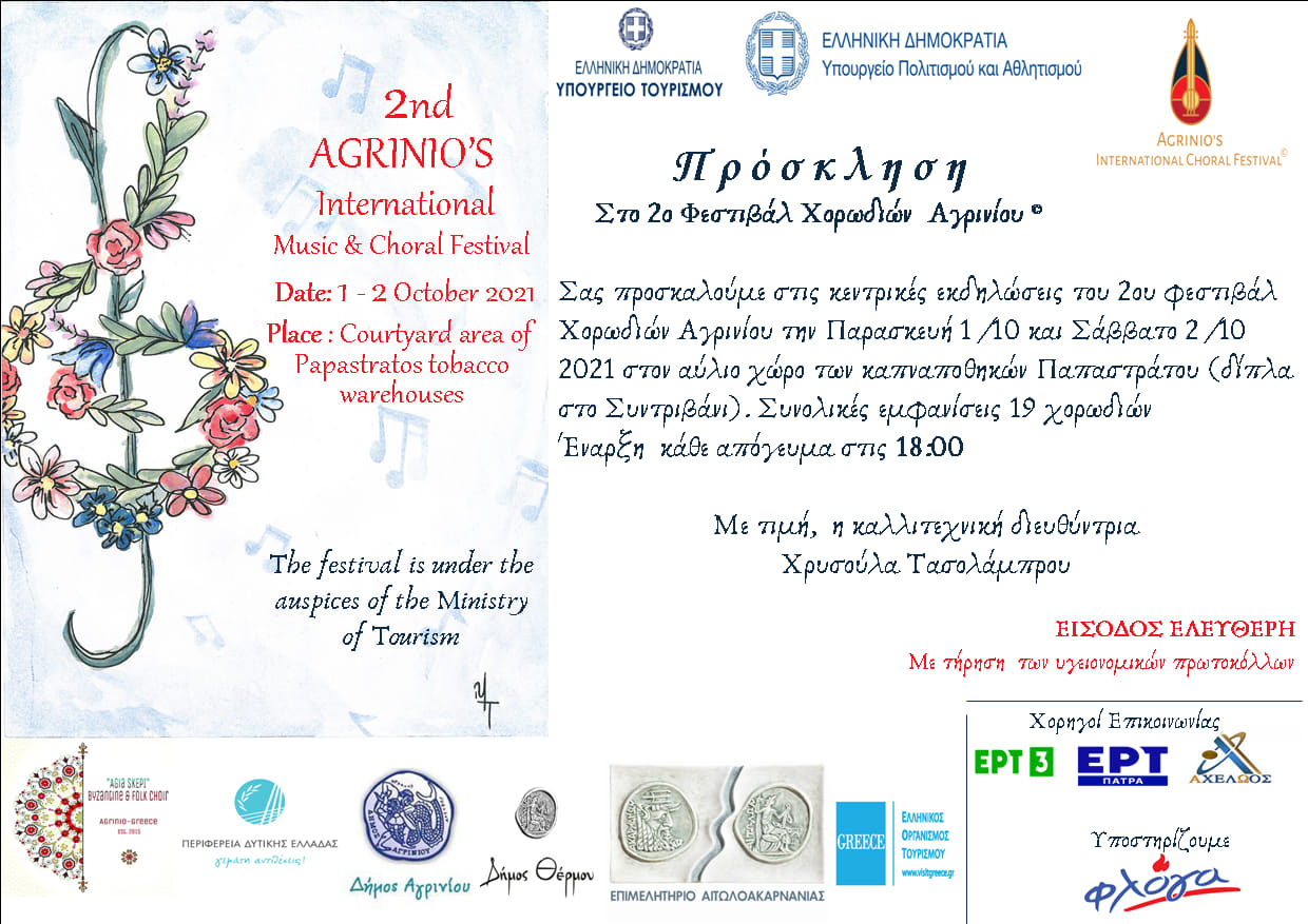 Το Φεστιβάλ Χορωδιών Αγρινίου (International Choir Festival) με Καλλιτεχνική Διευθύντρια την κα Χρυσούλα Τασολάμπρου, θα διεξαχθεί με τη συμμετοχή 19 Χορωδιών, στην φιλόξενη πόλη του Αγρινίου από 1 έως 3 Οκτωβρίου 2021. Ο χώρος διεξαγωγής των κεντρικών εκδηλώσεων θα είναι ο αύλειος χώρος των καπναποθηκών Παπαστράτου, στο κέντρο της πόλης.