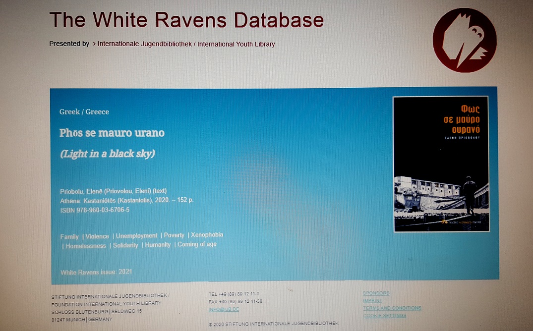 Το βιβλίο μου για εφήβους, "Φως σε μαύρο ουρανό" κατατάχτηκε από τη Διεθνή Βιβλιοθήκη του Μονάχου στα 200 καλύτερα βιβλία για το 2020, παγκοσμίως. Μικρές χαρές στα δύσκολα του κόσμου. Ευχαριστώ!»