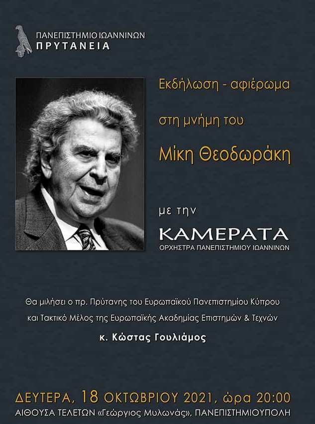 Με την Καμεράτα Ορχήστρα του Πανεπιστημίου Ιωαννίνων, υπό τη μουσική διεύθυνση του Γεωργίου Χλίτσιου οι φοιτητές του Τμήματος Μουσικών Σπουδών του Πανεπιστημίου Ιωαννίνων, Ανδρέας Φούκας και Καλλιόπη Μισαρλή, απέδωσαν εξαίρετα, τραγούδια του Μίκη Θεοδωράκη.