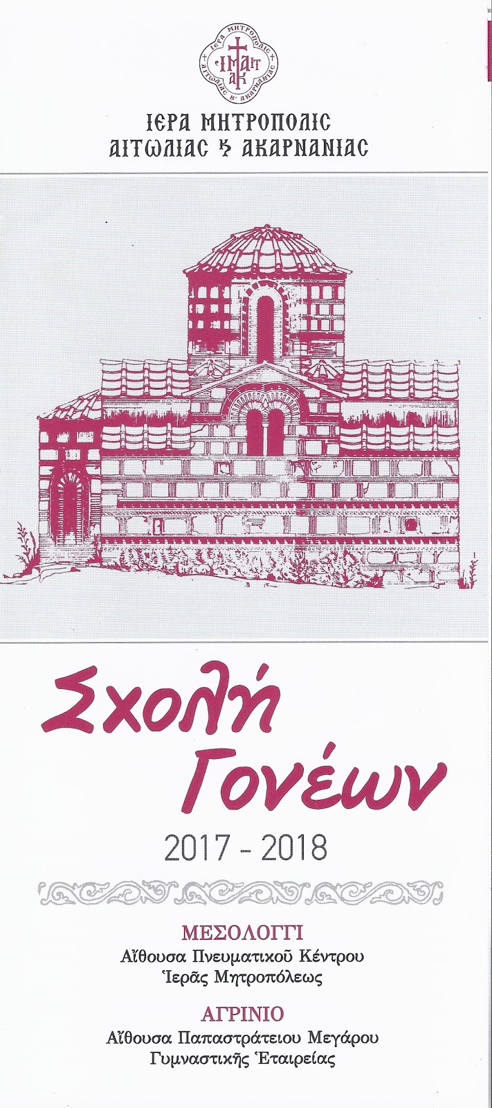 Η Ιερά Μητρόπολις Αιτωλίας και Ακαρνανίας ανακοινώνει ότι στην εκδήλωση της Σχολής Γονέων, που θα πραγματοποιηθεί την προσεχή Κυριακή 10 Δεκεμβρίου 2017 και ώρα 18:30 στο Παπαστράτειο Μέγαρο της Γυμναστικής Εταιρείας Αγρινίου, θα μιλήσει ο πανοσιολογιώτατος αρχιμανδρίτης Γέροντας Ιωσήφ, Καθηγούμενος της Ιεράς Μονής Ξηροποτάμου Αγίου Όρους.
