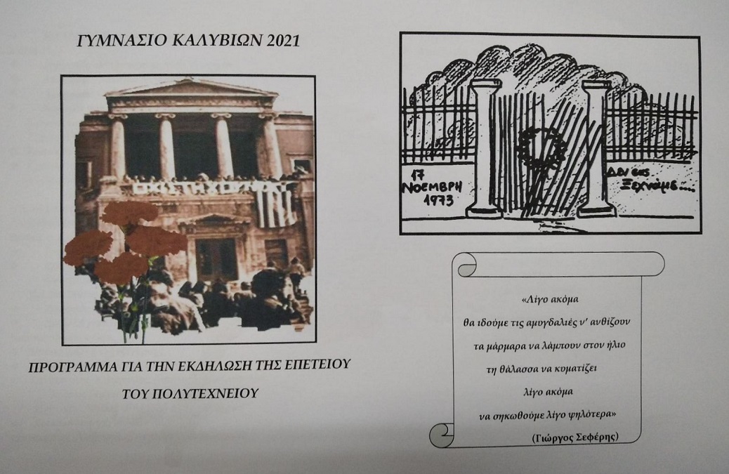 Εκδήλωση αφιερωμένη στην 48η Επέτειο από την εξέγερση των φοιτητών στο Πολυτεχνείο, το Νοέμβριο του ΄73 πραγματοποιήθηκε σήμερα στο Γυμνάσιο Καλυβίων, με τη συμμετοχή εκπαιδευτικών και μαθητών.