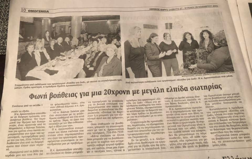 Η οργάνωση «Ελπίδα για ζωή» (Hope For Life) με Πρόεδρο την συμπατριώτισσά μας Ειρήνη Δρακοπούλου και τα μέλη που την απαρτίζουν συνεχίζουν το έργο της οικονομικής και ηθικής στήριξης στα Ελληνόπουλα με σοβαρές ασθένειες, αλλά και τις οικογένειές τους, όπως η πρόσφατη περίπτωση της 20χρονης Παρασκευής Αλεξανδρή από την Ελλάδα, η οποία πάσχει από μια δύσκολη ασθένεια και πήγε σε νοσοκομείο των ΗΠΑ για να την αντιμετωπίσει.