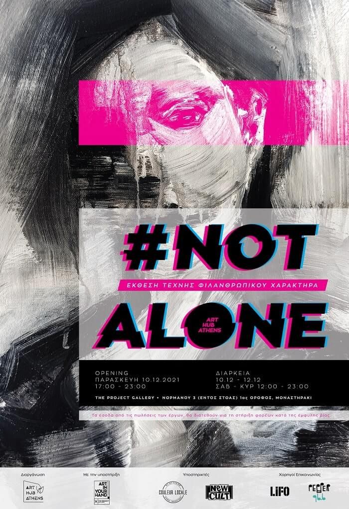Το ART HUB Athens με την υποστήριξη της «The Project Gallery» παρουσιάζει, στις 10-12 Δεκεμβρίου 2021, την ομαδική έκθεση τέχνης φιλανθρωπικού χαρακτήρα ¨Not Alone¨, με τη συμμετοχή σπουδαίων καλλιτεχνών και σκοπό τη στήριξη κακοποιημένων γυναικών.