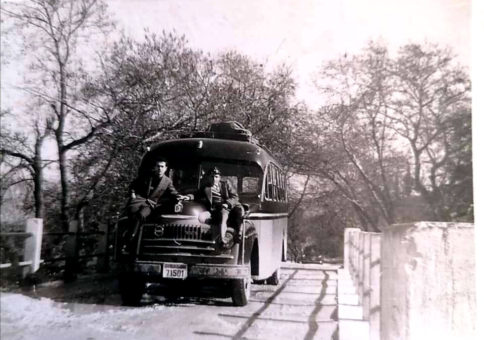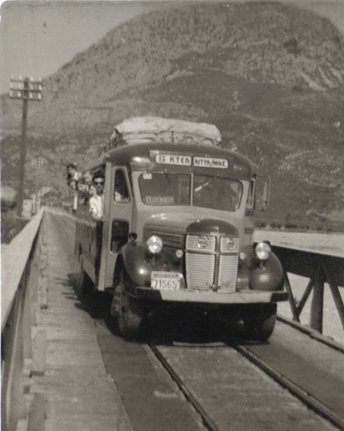 ΦΩΤΟ 3: Αρχές του ΄60. Εκδρομή του Δημοτικού Σχολείου Καλυβίων. Το λεωφορείο πάνω στη γέφυρα Ευήνου. Αρχείο Γ. Πανταζόπουλου