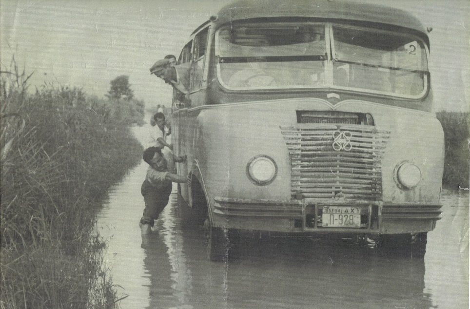 Πολλές φορές οι επιβάτες καλούνταν να βοηθήσουν τον οδηγό στην επιδιόρθωση του οχήματος για να συνεχίσουν το ταξίδι τους, ή να σπρώξουν για να το ξεκολλήσουν από τις λάσπες… Αρχείο Γ. Στρατόπουλου