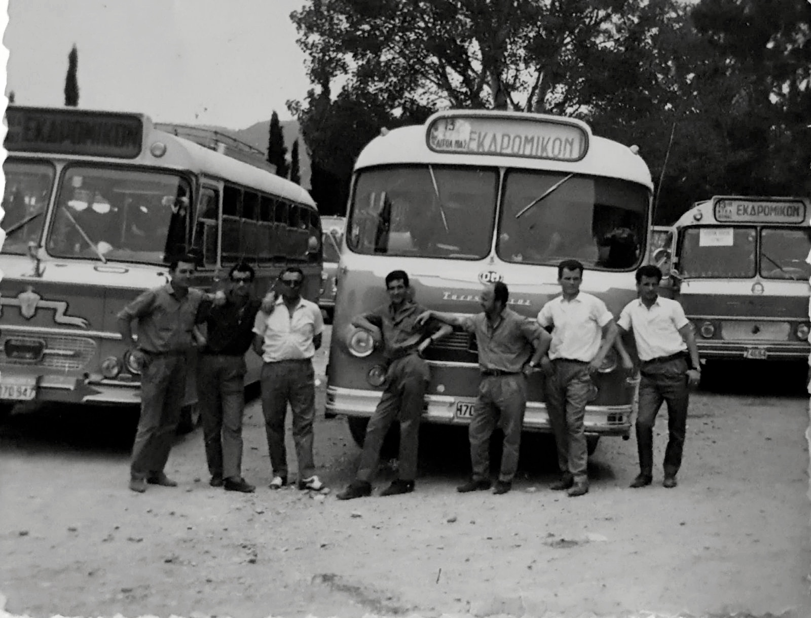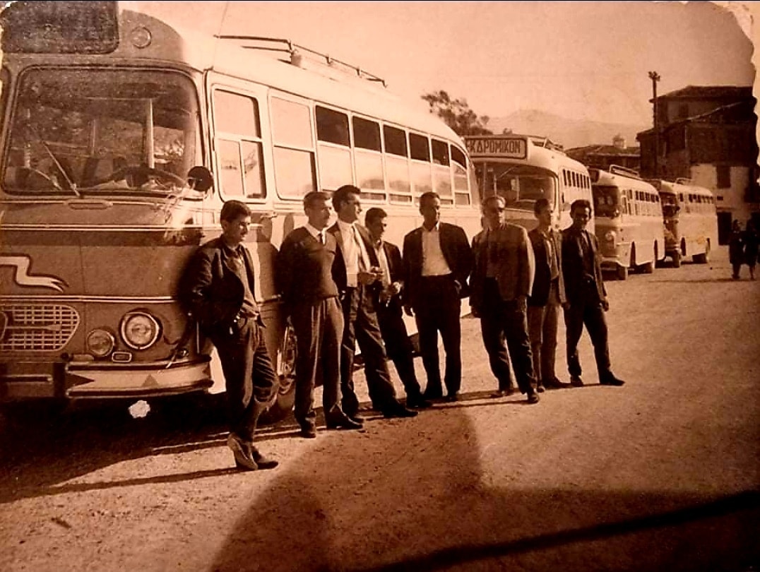 Λεωφορεία απο αριστερά: Magirus Νο 72 με οδηγό τον ΡΑΠΤΗ ΒΑΓΓΕΛΗ (μαύρο πουκάμισο και γυαλιά), OΜ το Νο 94 με οδηγό τον ΧΡΗΣΤΟ ΛΑΓΙΟΠΟΥΛΟ (προτελευταίος από δεξιά) και πίσω δεξιά το Νο 114 Biamax R495 με οδηγό τότε τον ΦΩΤΗΣ ΛΑΓΙΟΠΟΥΛΟΣ (τέρμα δεξιά στην φωτο) στην μέση που ακουμπά στο φανάρι, είναι ο ΓΙΑΝΝΗΣ ΡΑΠΤΗΣ ή (Σγάγιας) που δούλευε στο λεωφορείο του Βιάρου, καθώς και οι Εισπρακτορες τους...