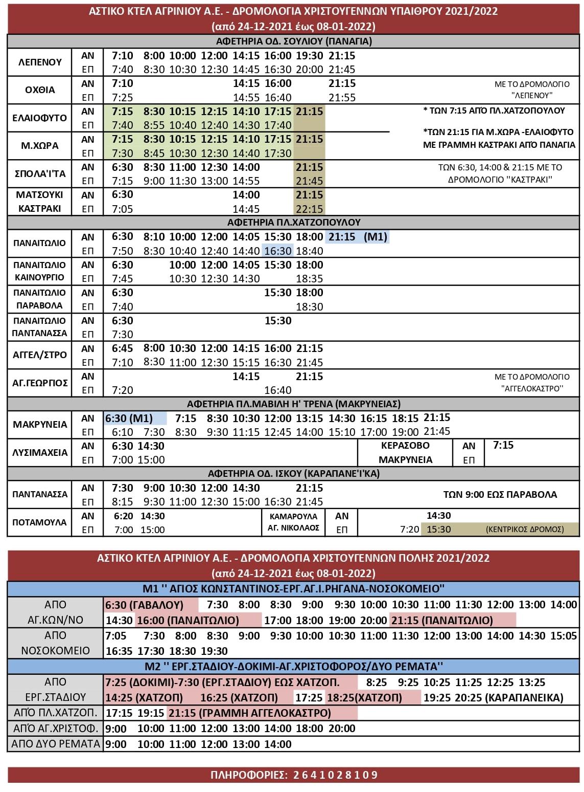 Εν όψει εορταστικής περιόδου Χριστουγέννων, Πρωτοχρονιάς και Θεοφανείων, όπως ανακοινώθηκε από το Αστικό ΚΤΕΛ Αγρινίου, έγιναν κάποιες αλλαγές στο πρόγραμμα των δρομολογίων λεωφορείων που θα ισχύσουν από 24/12/2021 έως 8/01/2022, ενώ ειδικά για την διαδρομή Πλάτανος - Καλύβια - Αγ. Γεώργιος – Αγγελόκαστρο, όλες τις μέρες, εκτός Σαββάτου και Κυριακής, τα δρομολόγια θα εκτελούνται ως εξής: