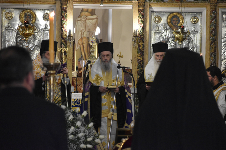 Στην εξόδιο ακολουθία χοροστάτησε ο Τοποτηρητής της Ι.Μ. Αιτωλίας, Σεβ. Μητροπολίτης Ναυπάκτου κ. Ιερόθεος, συγχοροστατούντων των Σεβ. Μητροπολιτών, Πειραιώς Σεραφείμ και Μεσογαίας Νικολάου.