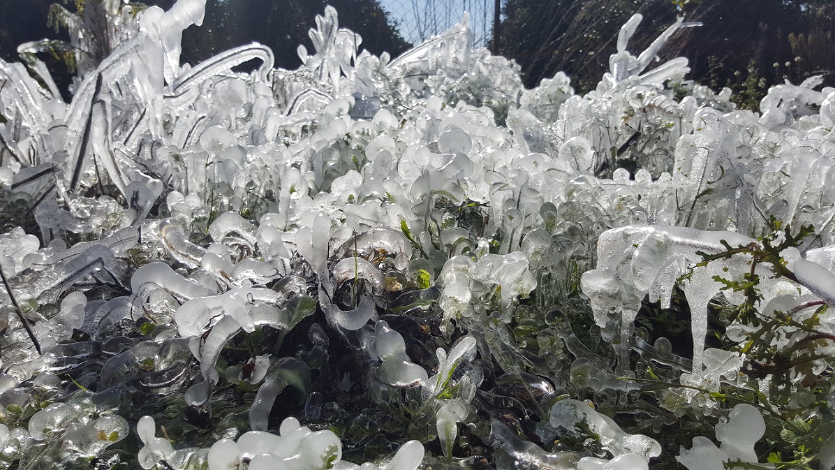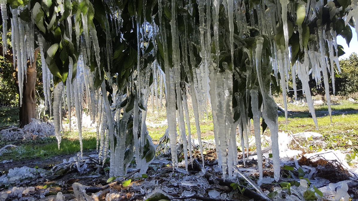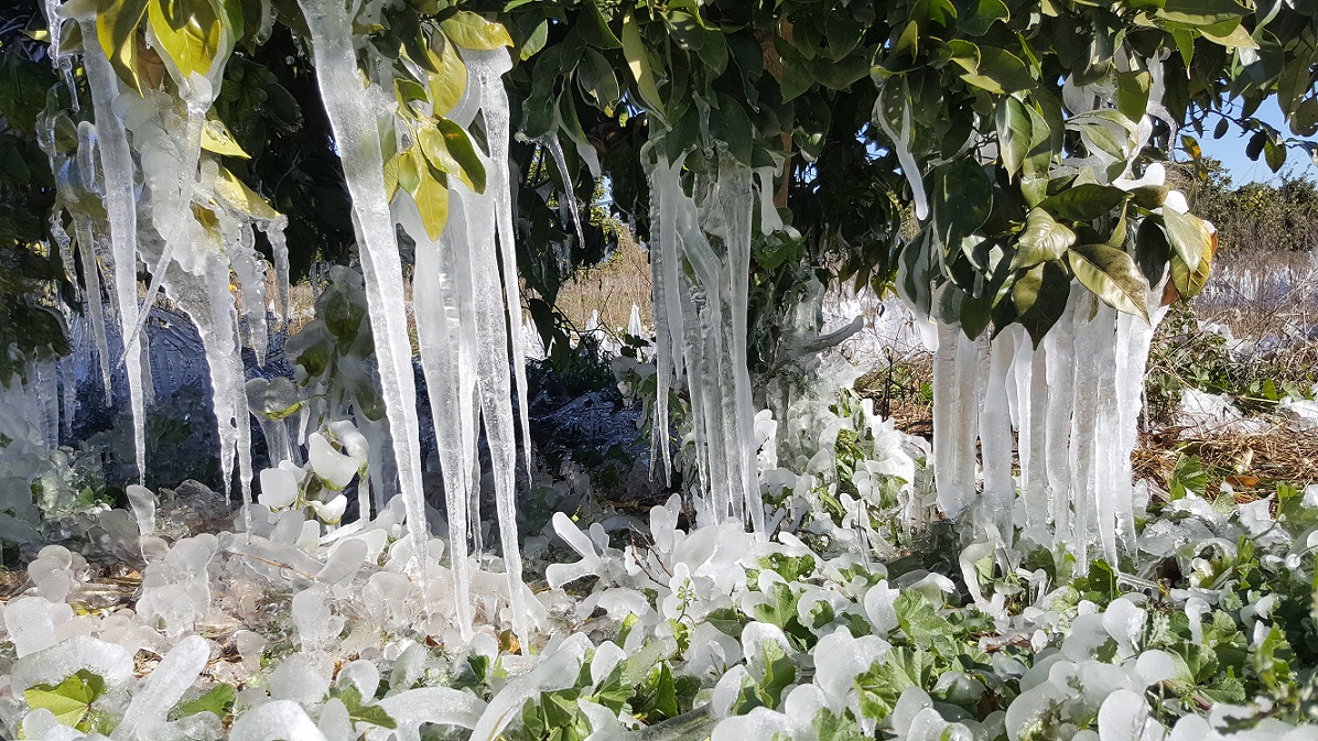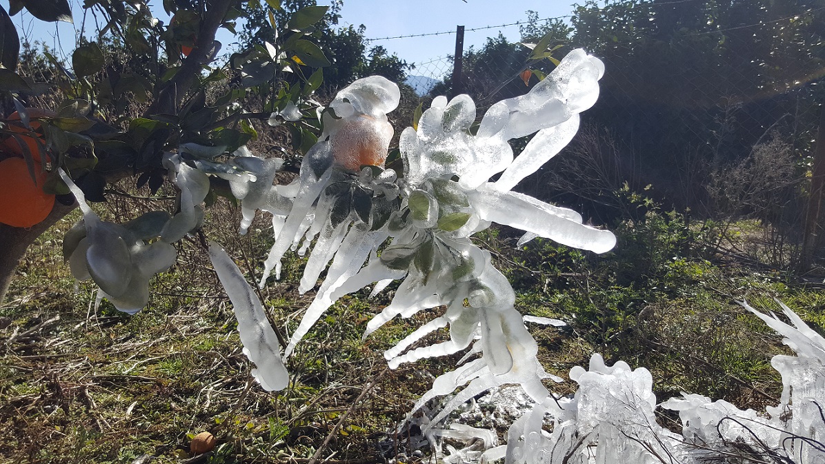 Εντυπωσιακές είναι οι εικόνες με τους παγωμένους κρυστάλλους σε πολλά περιβόλια στον Καλυβιώτικο κάμπο, αφού η θερμοκρασία χθες τη νύχτα αλλά και τις πρώτες πρωινές ώρες έφτασε τους -4 βαθμούς Κελσίου με αποτέλεσμα να ¨παγώσουν¨ τα δέντρα και να γεμίσουν σταλακτίτες!