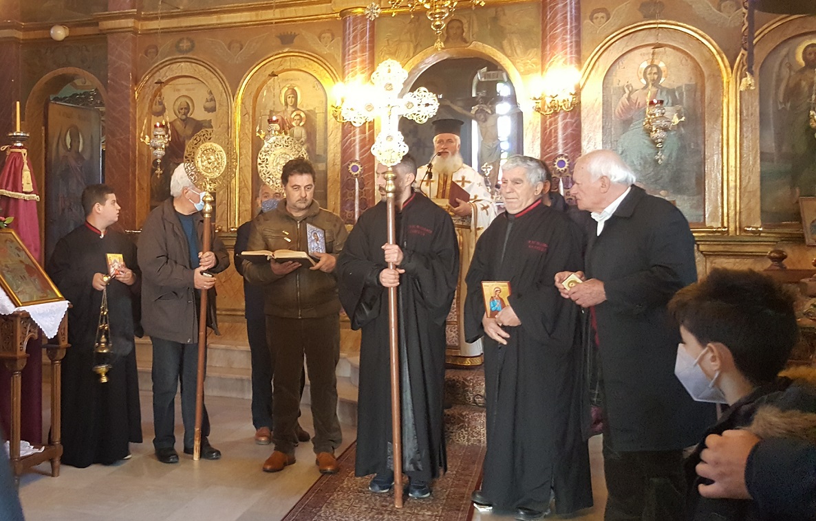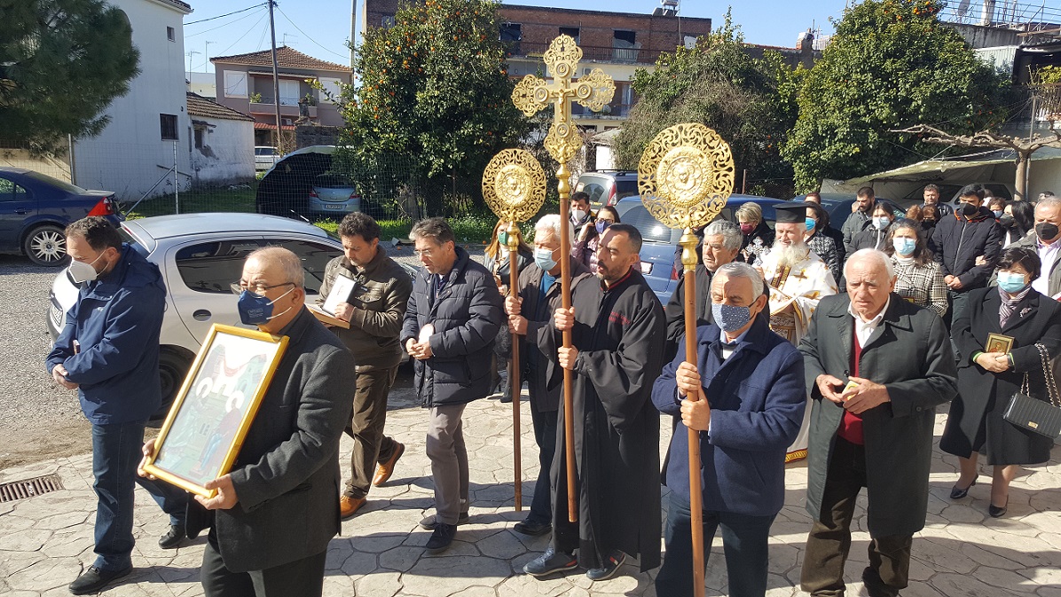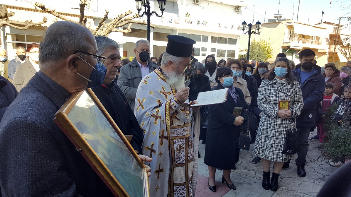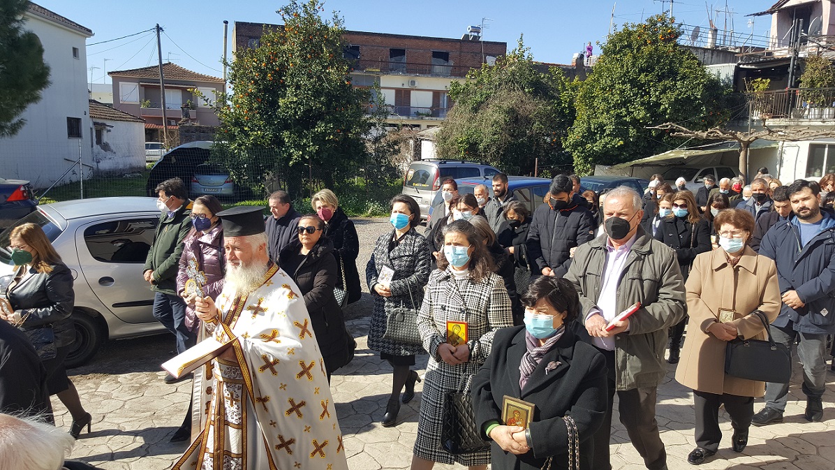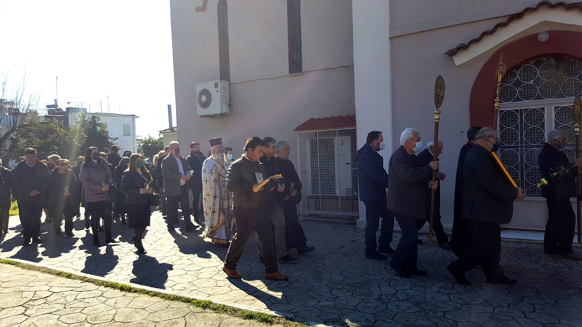 Ο πατήρ Θ. Αθανασόπουλος, συνοδεία των ιεροψαλτών, των επιτρόπων του ναού και πολλών πιστών που κρατούσαν τις εικόνες που έφεραν από τα σπίτια τους, διάβασε σε τέσσερις στάσεις πέριξ της εκκλησίας, παρακλήσεις και ύμνους για τη σημερινή γιορτή της Ορθοδοξίας.