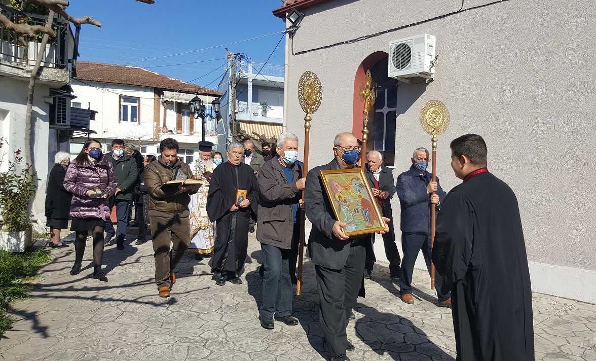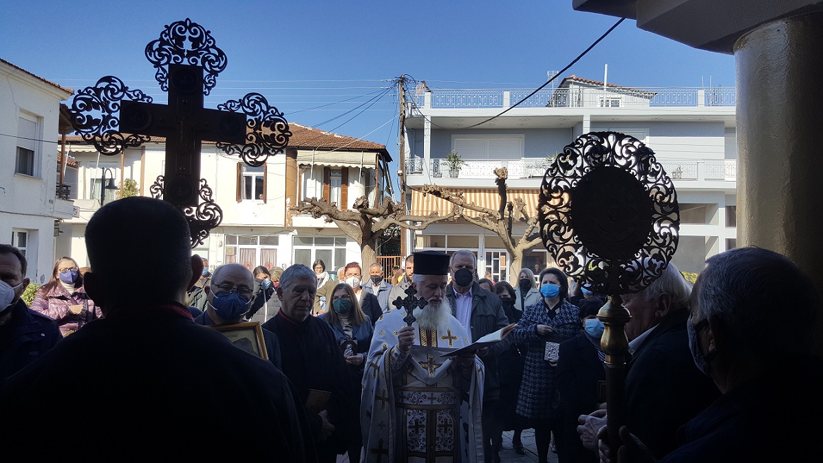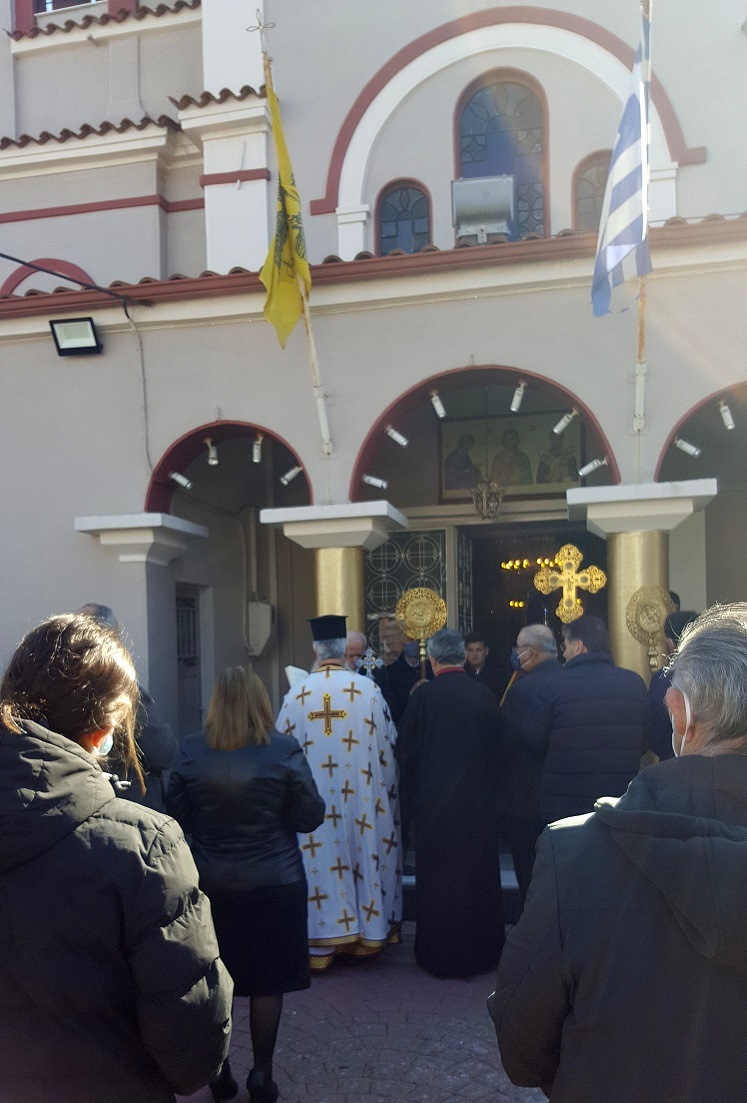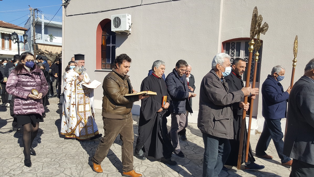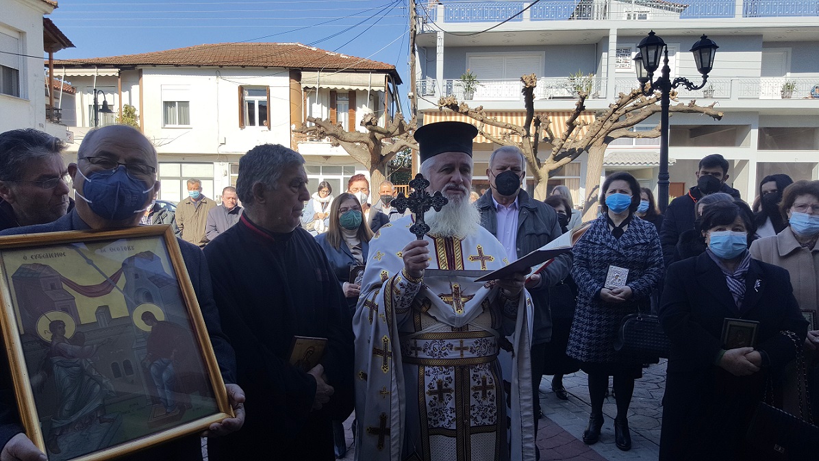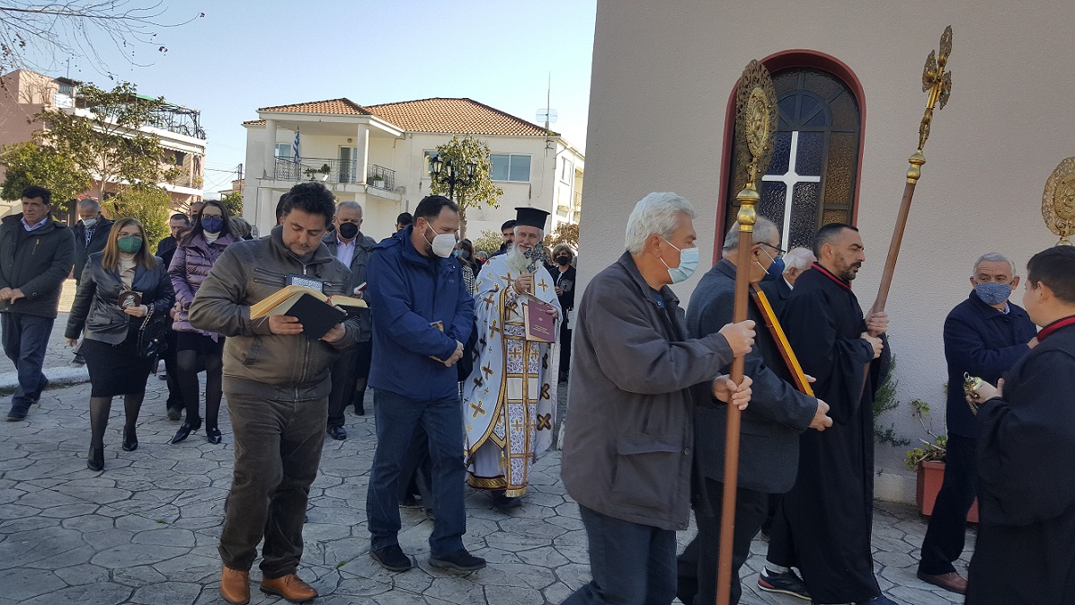 Ο πατήρ Θ. Αθανασόπουλος, συνοδεία των ιεροψαλτών, των επιτρόπων του ναού και πολλών πιστών που κρατούσαν τις εικόνες που έφεραν από τα σπίτια τους, διάβασε σε τέσσερις στάσεις πέριξ της εκκλησίας, παρακλήσεις και ύμνους για τη σημερινή γιορτή της Ορθοδοξίας.