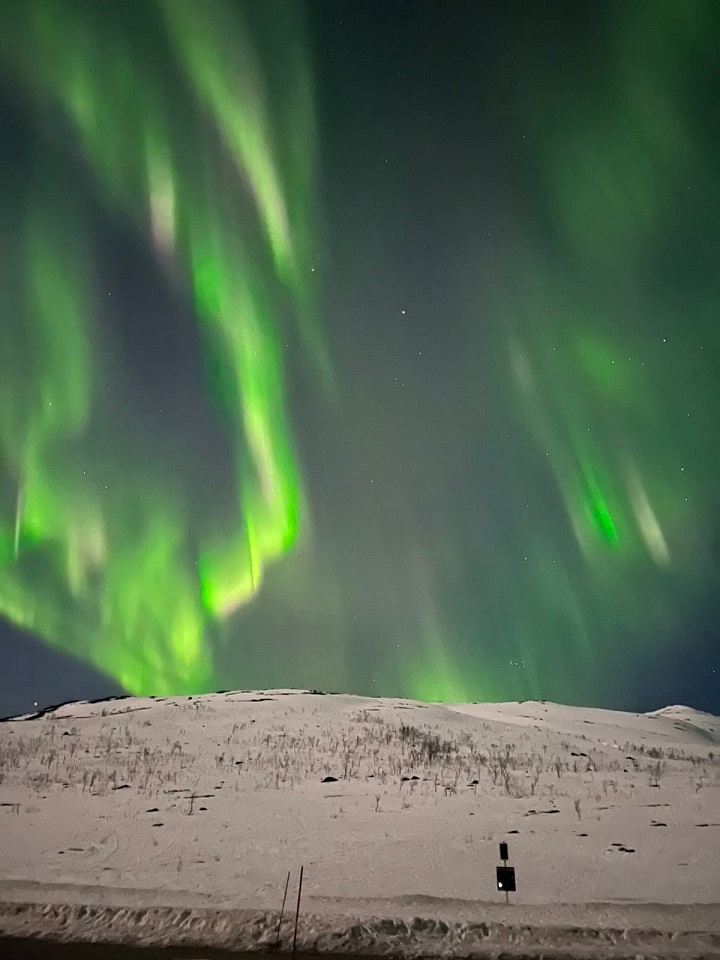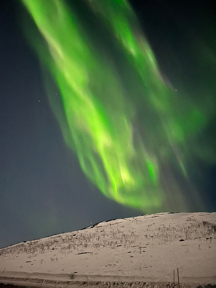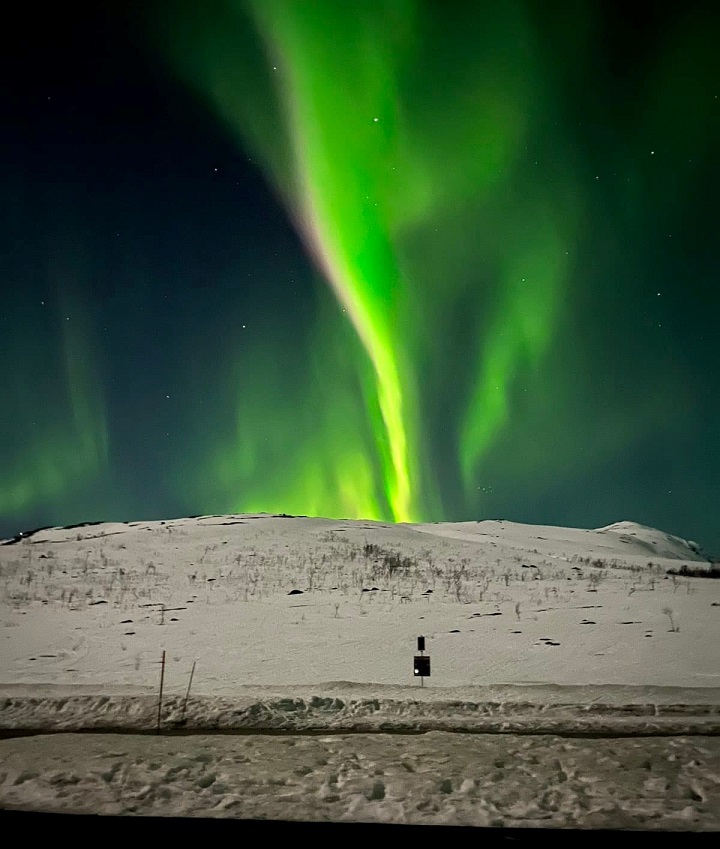 Ταξίδεψαν λοιπόν 35 χλμ. από το Τρόμσο, στις 11 το βράδυ, σε χιονισμένα τοπία και δρόμους για να μπορέσουν να βρουν τα σημεία εκείνα που προσφέρουν προνομιακή θέαση για να παρατηρήσουν το Βόρειο Σέλας!