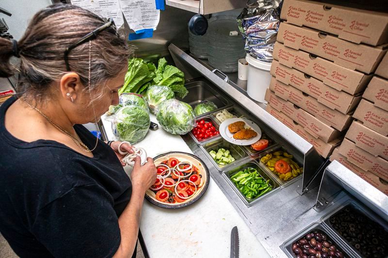 Η Χριστίνα Λαμνάτου-Ψιλογιαννοπούλου φτιάχνει σπεσιαλιτέ πίτσα στο Subway Cafe στο Χάρισμπουργκ.