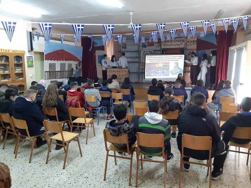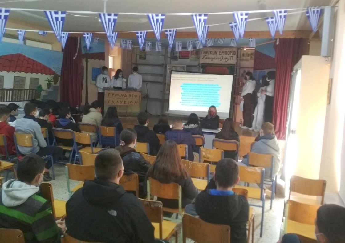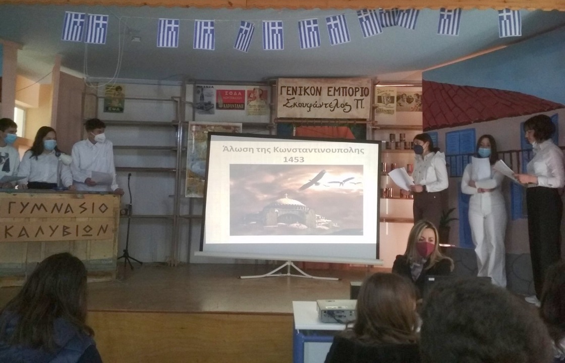 Πραγματοποιήθηκε το πρωί η σχολική γιορτή για την Εθνική Επέτειο της ¨25ης Μαρτίου 1821¨ στην αίθουσα εκδηλώσεων του Γυμνασίου Καλυβίων, με την παρουσία εκπαιδευτικών και μαθητών.