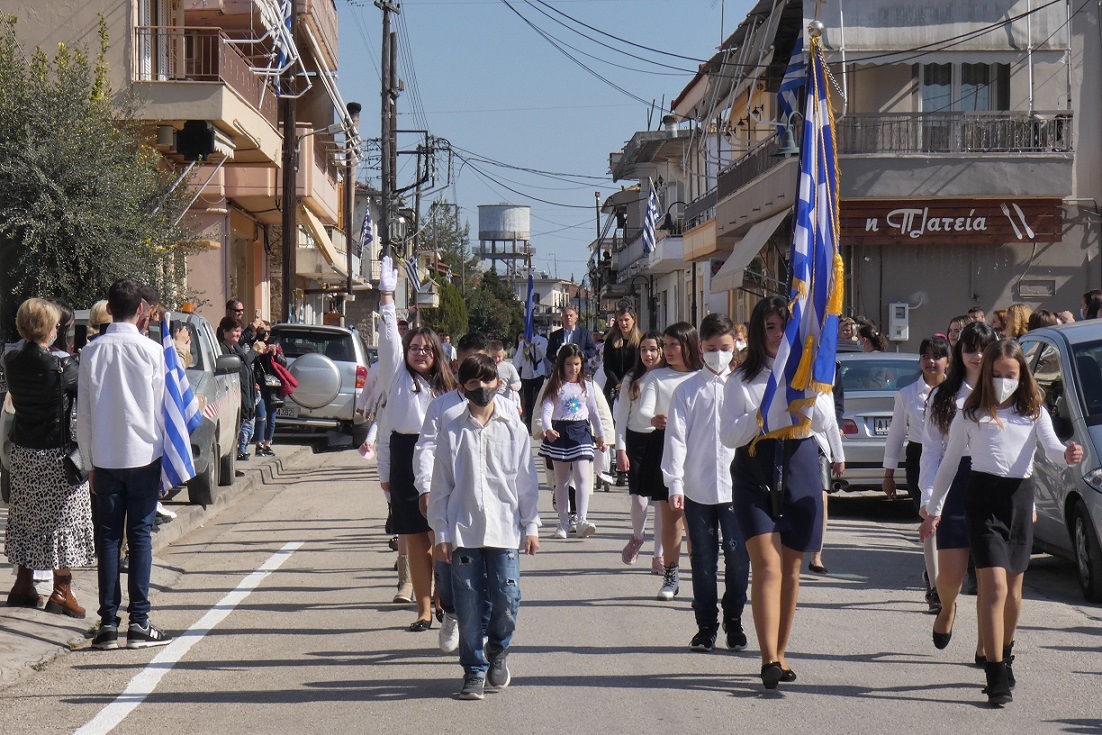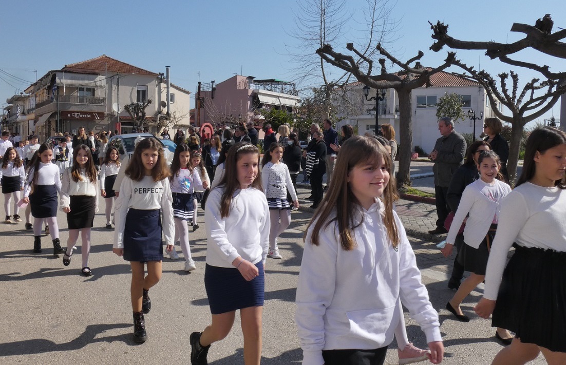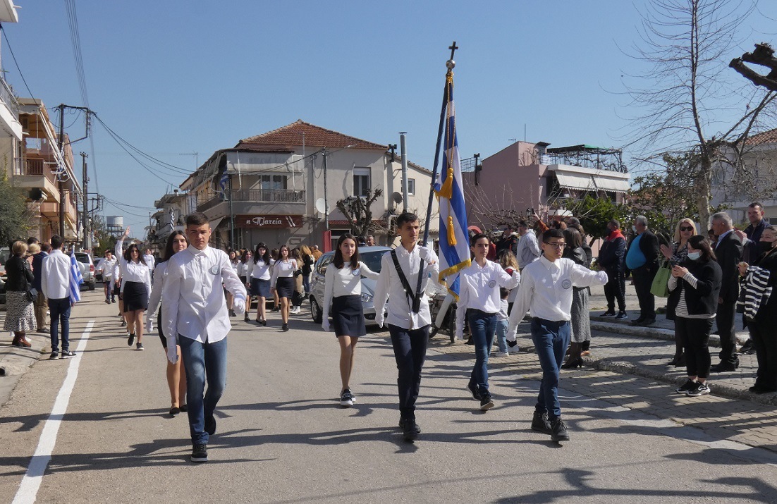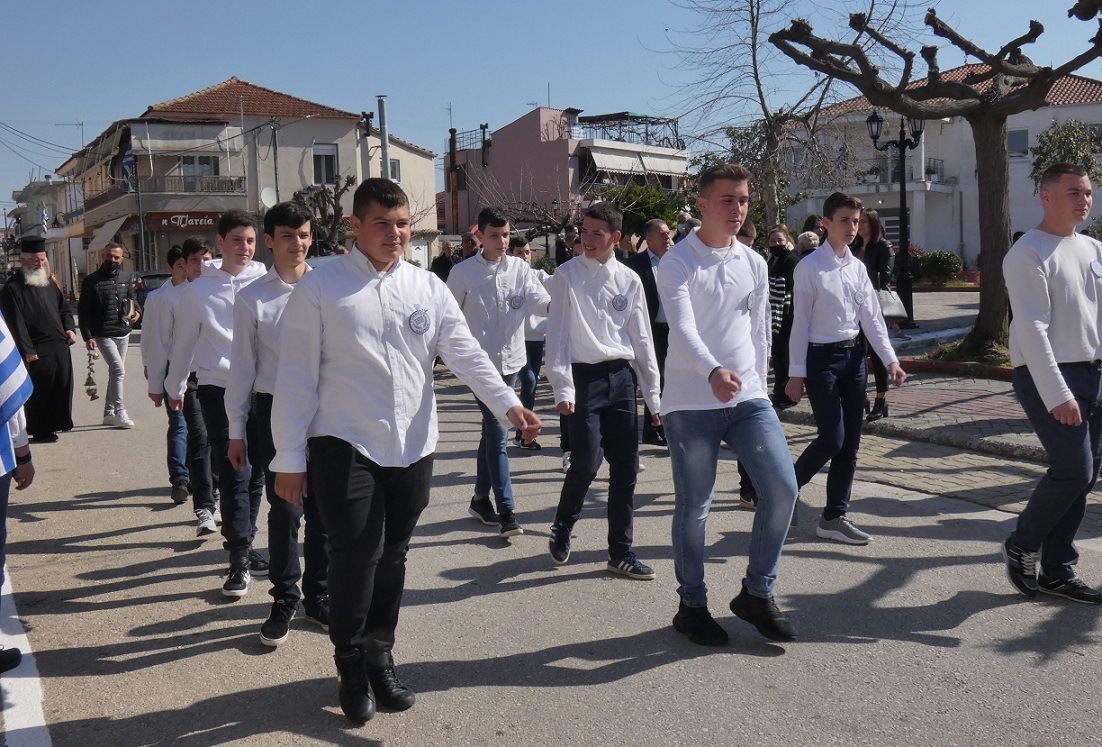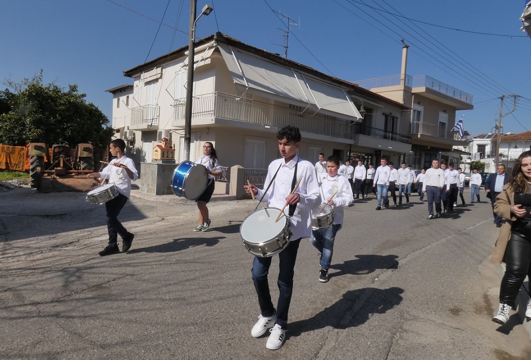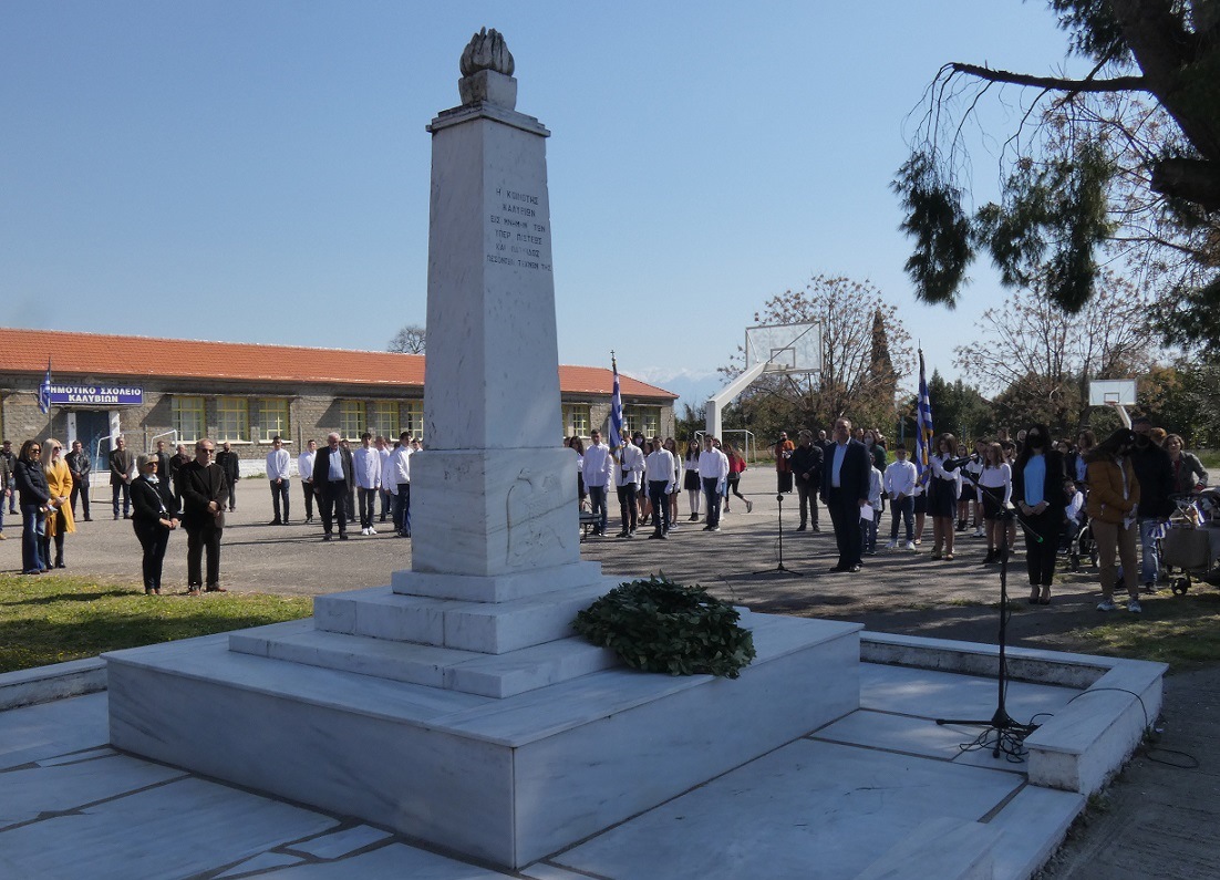 Αμέσως μετά, με μια ηλιόλουστη και λαμπερή μέρα, στους κεντρικούς δρόμους του χωριού μας, οι κάτοικοι παρακολούθησαν και χειροκρότησαν την παρέλαση των μαθητών του Νηπιαγωγείου, του Δημοτικού Σχολείου και του Γυμνασίου Καλυβίων, για να ολοκληρωθεί η πορεία στο Μνημείο των Πεσόντων, όπου τελέσθηκε η επιμνημόσυνη δέηση για τους πεσόντες υπέρ Πατρίδος.