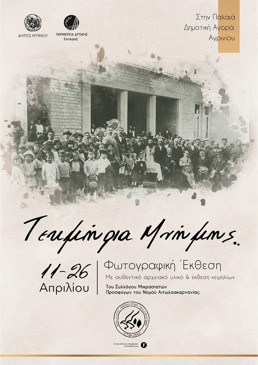 Στο πλαίσιο αυτό τη Δευτέρα 11 Απριλίου 2022, στις 7:00 μ.μ. θα γίνει η Έναρξη Φωτογραφικής έκθεσης «Τεκμήριο μνήμης» με αυθεντικό αρχειακό υλικό και έκθεση κειμηλίων του Συλλόγου Μικρασιατών Προσφύγων του Νομού Αιτωλοακαρνανίας.