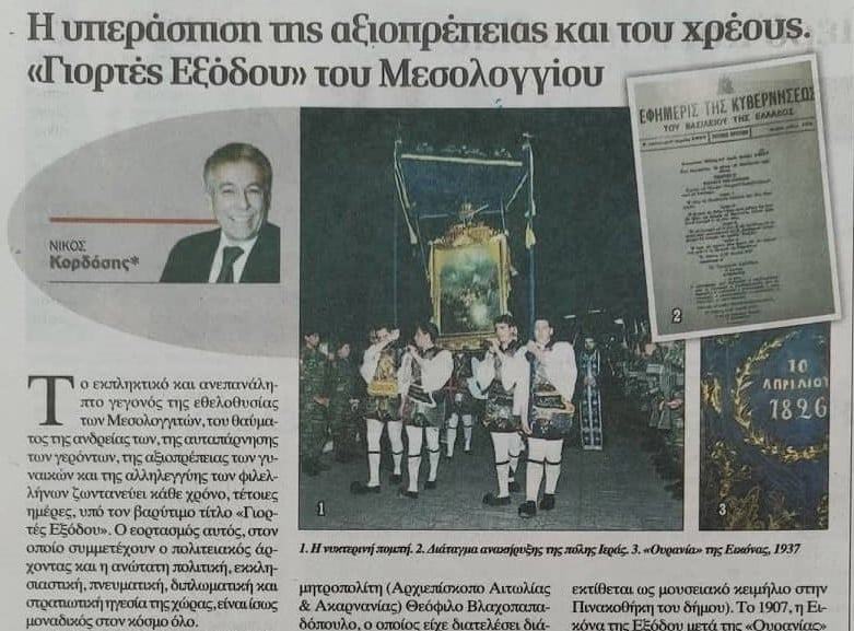 Ο δικηγόρος Νίκος Κορδόσης, Ιδρυτής - Διευθύνων Σύμβουλος στο Κέντρο Λόγου και Τέχνης - Μουσείο "ΔΙΕΞΟΔΟΣ" στο Μεσολόγγι, με άρθρο του στο σημερινό φύλλο της εφημερίδας «Κυριακάτικη Δημοκρατία» καταγράφει τις ιστορικές μνήμες και καταθέτει το προσωπικό του «χρέος» για τη θυσία των Ελεύθερων Πολιορκημένων και την ηρωϊκή Έξοδο των Μεσολογγιτών!