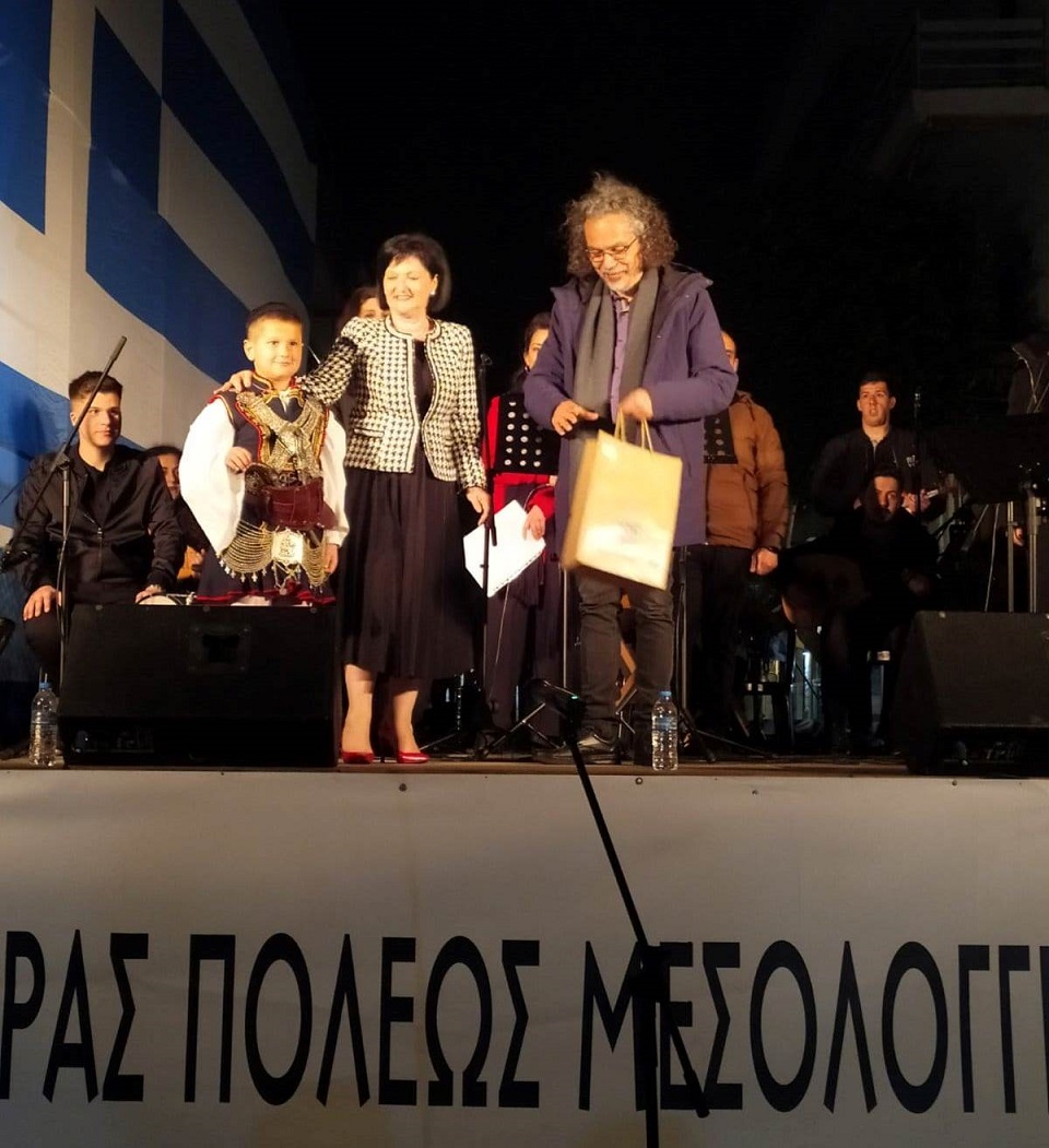 Στην εκδήλωση παρευρέθηκαν και απηύθυναν χαιρετισμούς, η Αντιπεριφερειάρχης Π.Ε. Αιτωλοακαρνανίας, Μαρία Σαλμά, ο Δήμαρχος Μεσολογγίου, Κώστας Λύρος, ο Πρύτανης του Πανεπιστημίου Πατρών, Χρήστος Μπούρας και ο Aντιπεριφερειάρχης Πολιτισμού και Τουρισμού Περιφέρειας Δυτ. Ελλάδας, Νικόλαος Κοροβέσης, λέγοντας ότι: «Σήμερα είναι μια ξεχωριστή ημέρα όχι μόνο για τους πολίτες του Μεσολογγίου αλλά και όλης της Ελλάδας. Βρισκόμαστε όλοι εδώ για να γιορτάσουμε και τιμήσουμε τα ανυπέρβλητα κατορθώματα των ανδρείων υπερασπιστών του τόπου αυτού, που ο χρόνος δεν είναι ικανός να αδυνατίσει την μνήμη , να μας κάνει να τα λησμονήσουμε. Αλλά και πως θα ήταν δυνατό να λησμονήσουμε το αιώνιο σύμβολο της ηρωικής θυσίας , που μπροστά της λύγισαν ακόμα και οι πιο σθεναρές συνειδήσεις;»