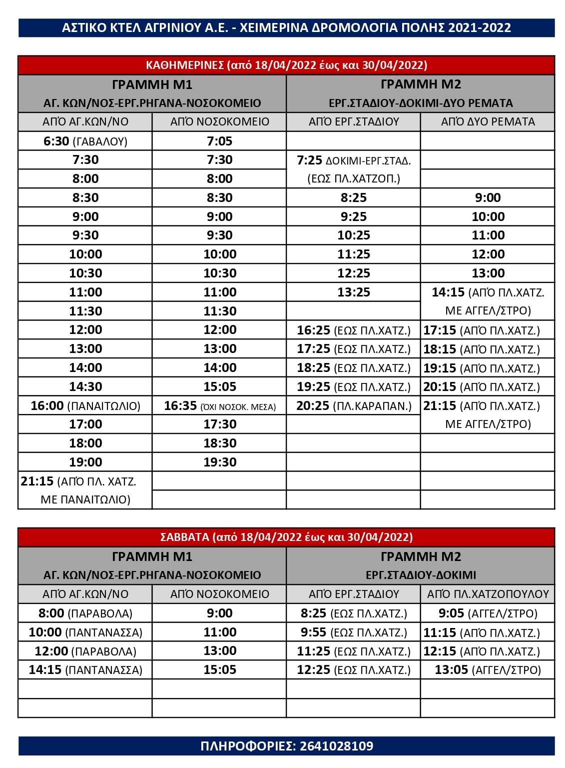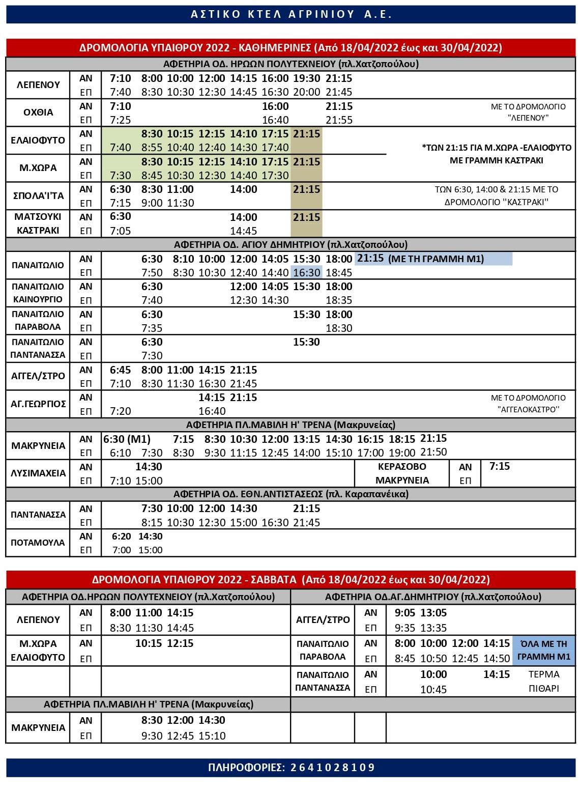 Από Μ. Δευτέρα 18/04/2022 έως και Σάββατο μετά το Πάσχα 30/04/2022 θα ισχύουν τα κάτωθι δρομολόγια, όπως ανακοινώθηκαν από το Αστικό ΚΤΕΛ Αγρινίου ενώ την επόμενη εβδομάδα θα ανακοινωθούν ώρες έναρξης και λήξης των δρομολογίων τις ημέρες Μ. Πέμπτη και Μ. Παρασκευή.