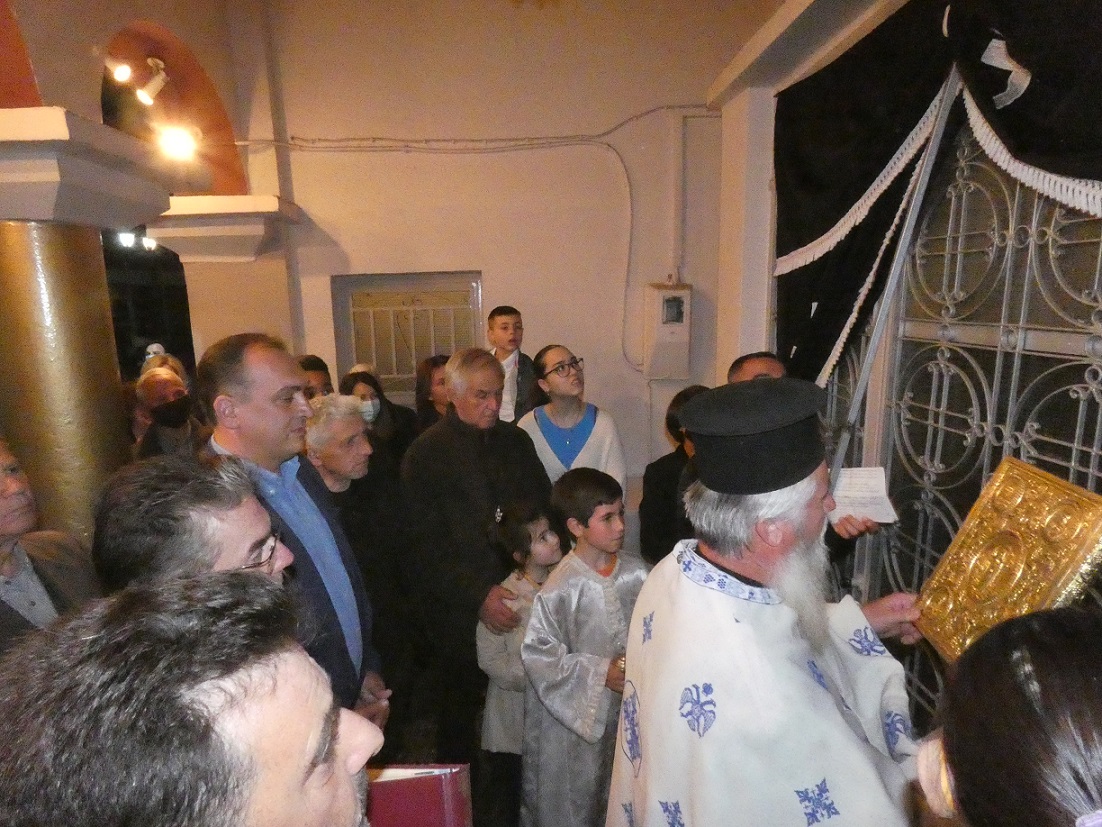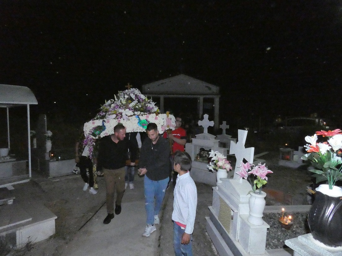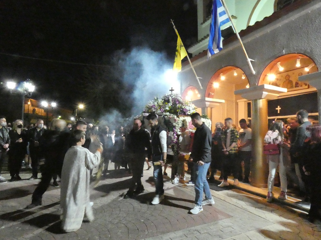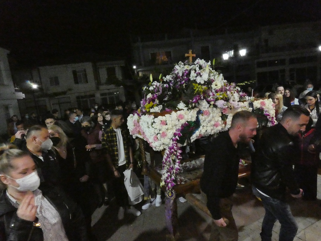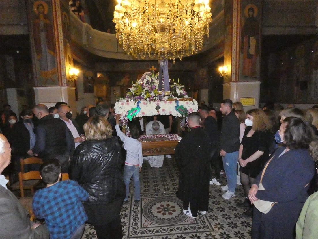 Στη συνέχεια οι πιστοί, κρατώντας αναμμένα κεριά, ακολούθησαν την περιφορά του Επιταφίου γύρω από το ναό, ο οποίος ήταν στολισμένος με πολύχρωμα λουλούδια και κατευθύνθηκαν προς το εξωκλήσι του παλαιού Αγ. Νικολάου.