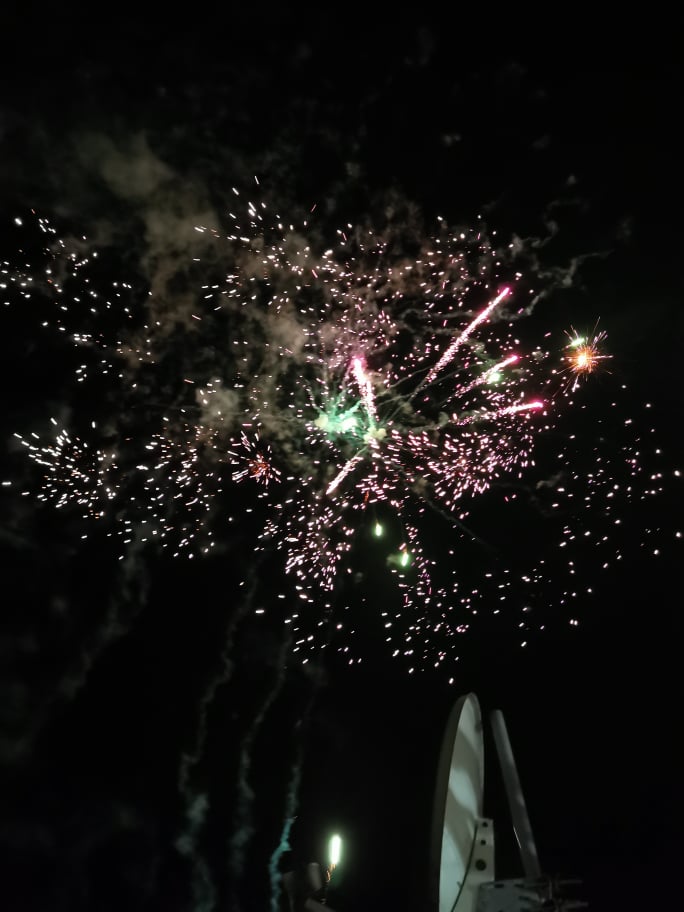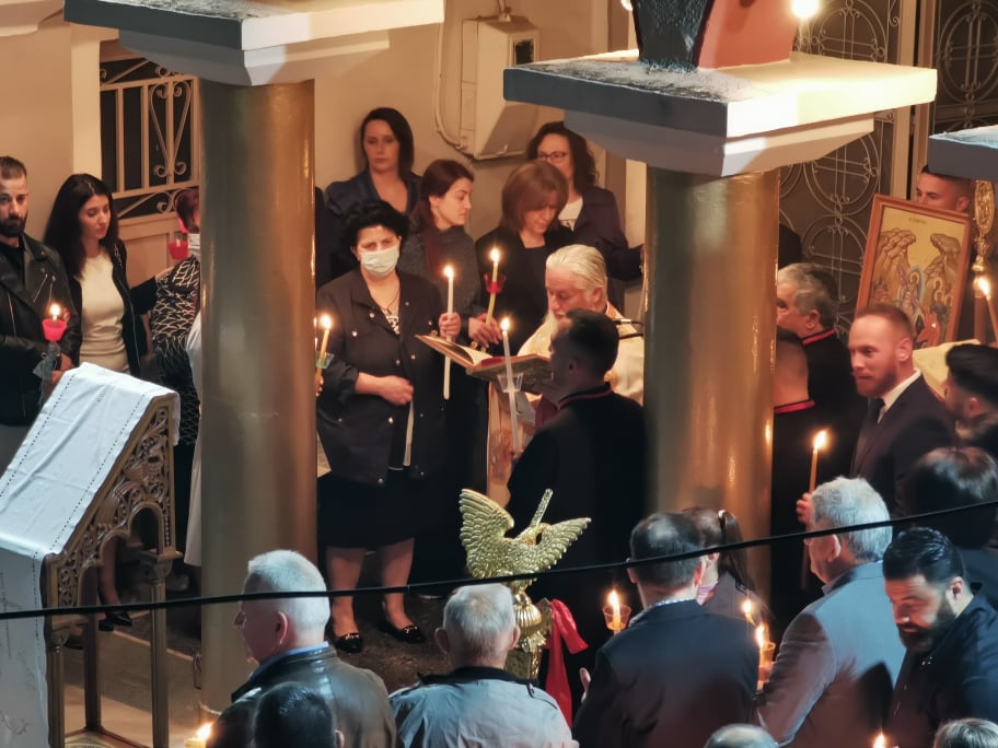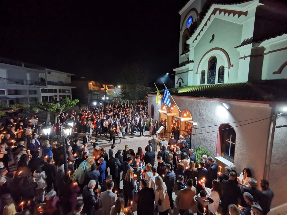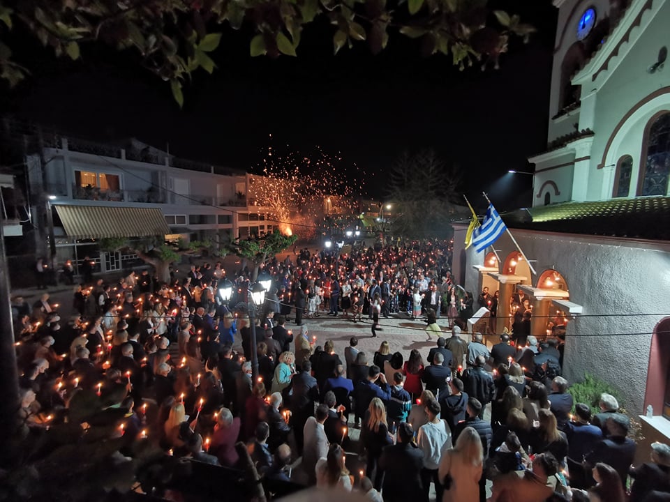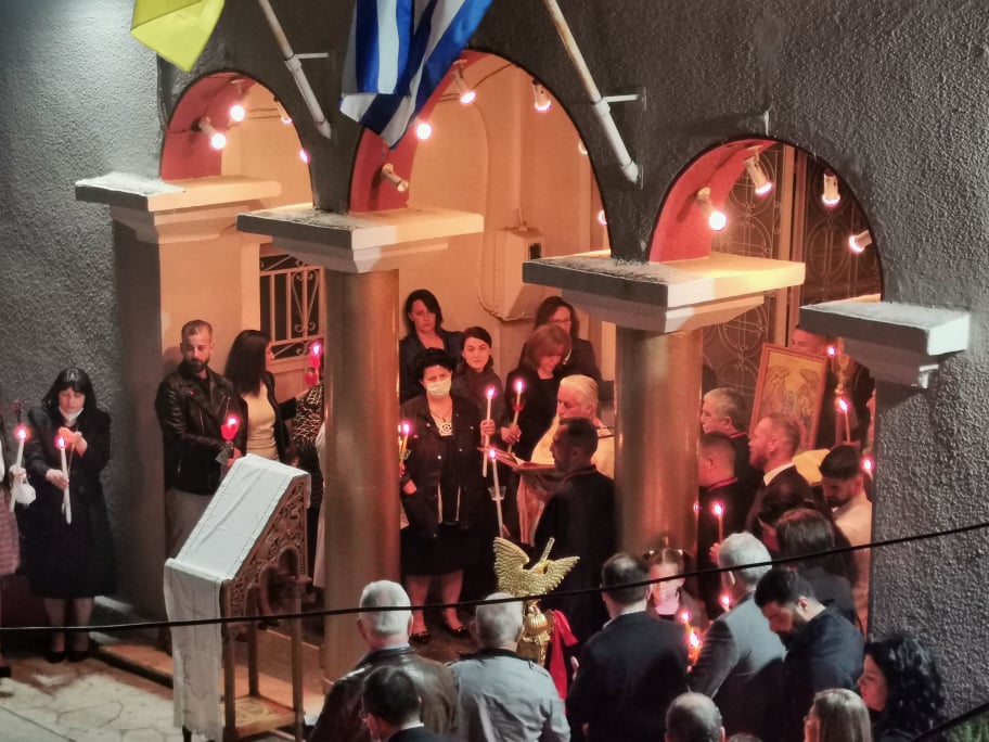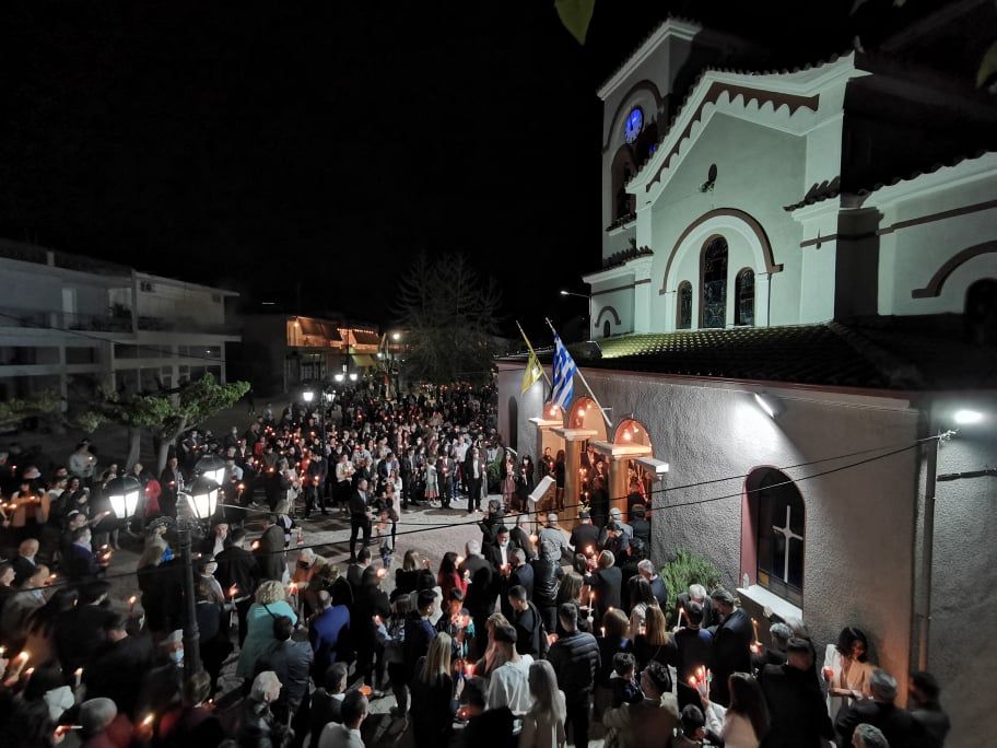 Στο προαύλιο του ναού λίγο μετά τα μεσάνυχτα ακούστηκε το «Χριστός Ανέστη» από τον ιερέα Θ. Αθανασόπουλο και τους ιεροψάλτες, οι καμπάνες χτυπούσαν χαρμόσυνα, ενώ το νυχτερινό ουρανό φώτισαν οι λάμψεις των δεκάδων πυροτεχνημάτων.