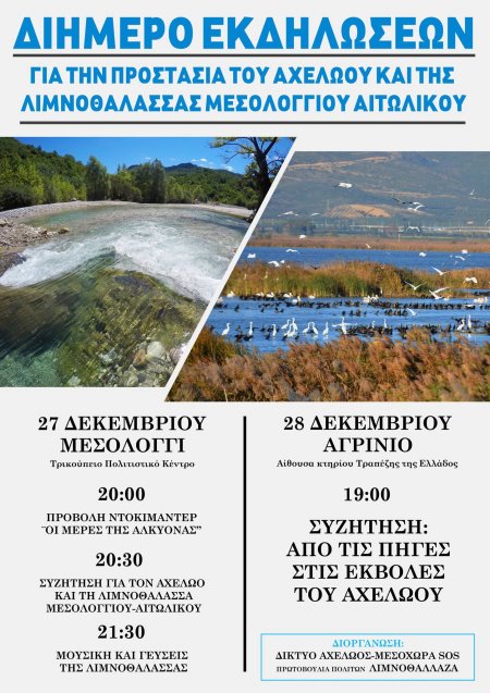 Στις 28 Δεκεμβρίου, στο Αγρίνιο (Αίθουσα Κτιρίου Τραπέζης της Ελλάδος, στις 19:00) θα πραγματοποιηθεί η 2η μέρα των εκδηλώσεων για την προστασία της Λιμνοθάλασσας και του Αχελώου.
