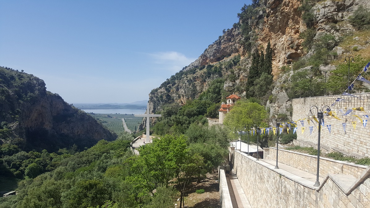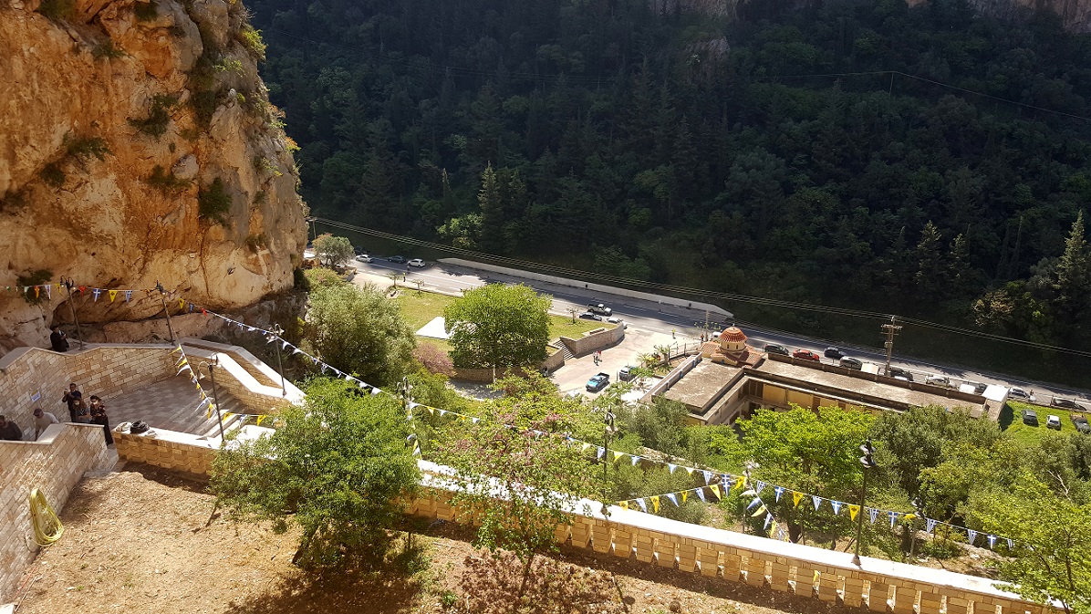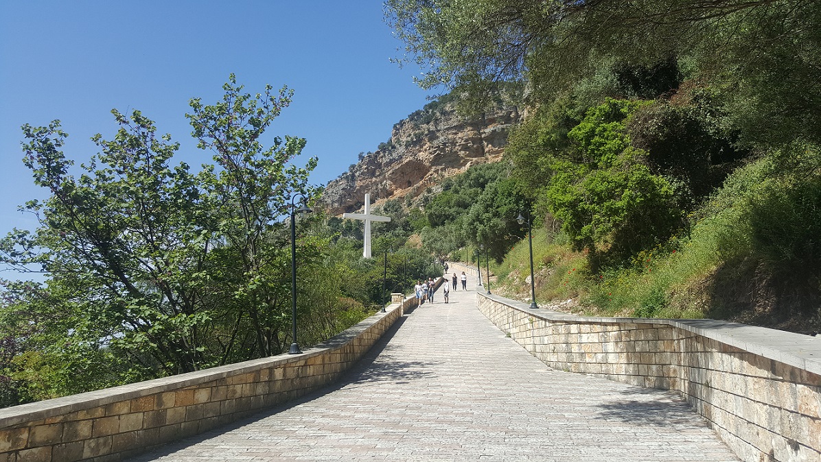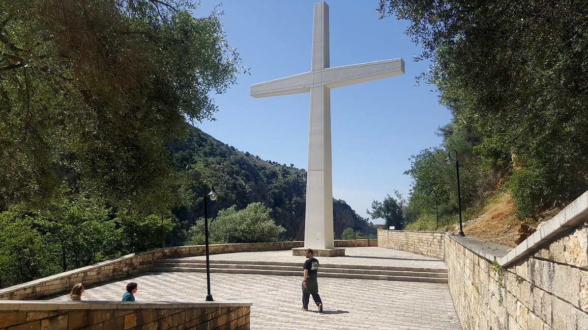 Στο μέσο της διαδρομής, από το νέο κτήριο ως το εκκλησάκι, είναι τοποθετημένος ένας Σταυρός που προκαλεί δέος σε όλους τους επισκέπτες.Το ύψος του φτάνει τα 16μ..Δημιουργήθηκε όταν ένα τμήμα του βράχου κόπηκε και στην θέση του κατασκευάστηκε η βάση του Σταύρου.Η εκσκαφή είχε βάθος τέσσερα μέτρα.Ο μεγάλος Σταύρος, που διακρίνεται από μακριά, προϊδεάζει τον προσκυνητή αλλά και τον επισκέπτη για το μεγάλο συνάπαντημα της ιστορίας μας με τη θρησκεία μας στην κάθετη πλαγιά του βουνού, ενώ του δίνει δύναμη για να συνεχίσει την πορεία του προς τον ναό.Εκεί βρίσκεται και η εικόνα της Παναγίας που στη συνέχεια θα την προσκυνήσει.