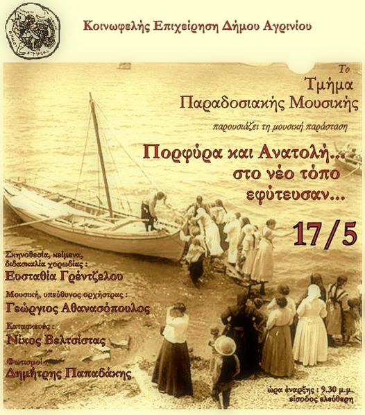 Το Τμήμα Παραδοσιακής Μουσικής της Κ.Ε.Δ. Αγρινίου, παρουσιάζει τη μουσική παράσταση «Πορφύρα και Ανατολή… στο νέο τόπο εφύτευσαν...» την Τρίτη 17 Μαΐου 2022 στο Δημοτικό Θέατρο Αγρινίου. Ώρα έναρξης 9.30 μ.μ. με ελεύθερη είσοδο.