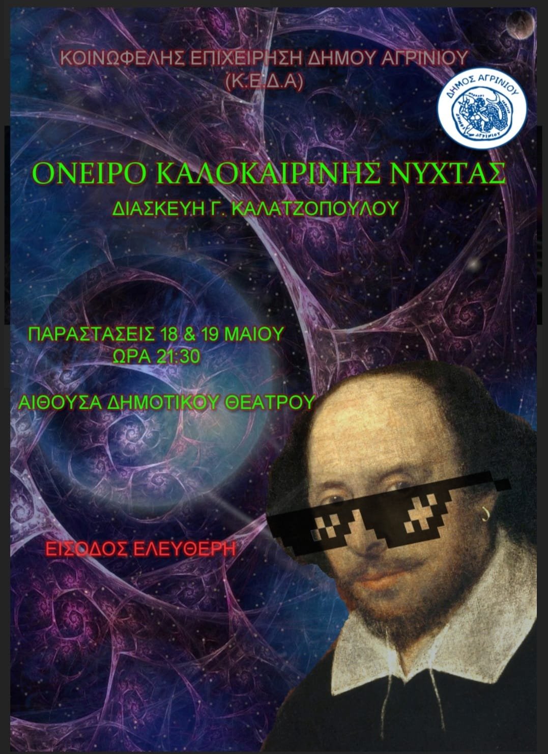 Η Θεατρική ομάδα "παιΖΟΥΜΕ" της Κοινωφελούς Επιχείρησης Δήμου Αγρινίου παρουσιάζει την παράσταση "Όνειρο θερινής νύχτας" του Σαίξπηρ, σε διασκευή Γ. Καλατζόπουλου και σκηνοθεσία Μαρίνας Καραφά, τηνΤετάρτη 18 και την Πέμπτη 19 Μαΐου, στις 21:30 στο Δημοτικό Θέατρο Αγρινίου.