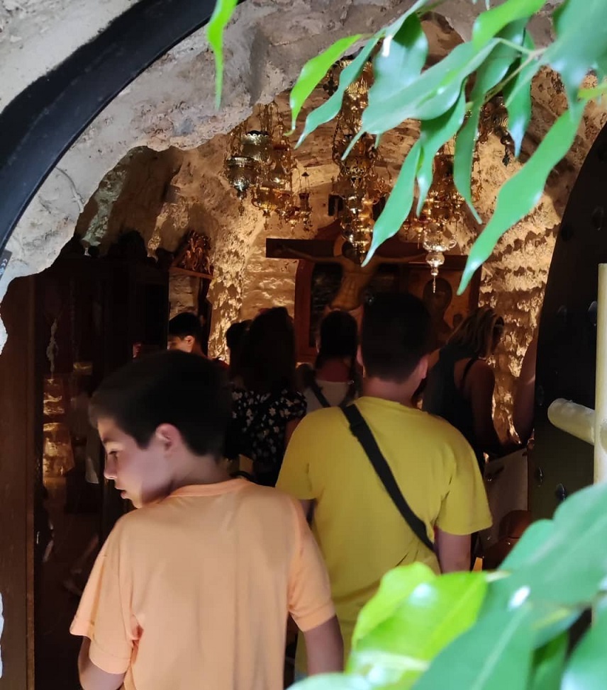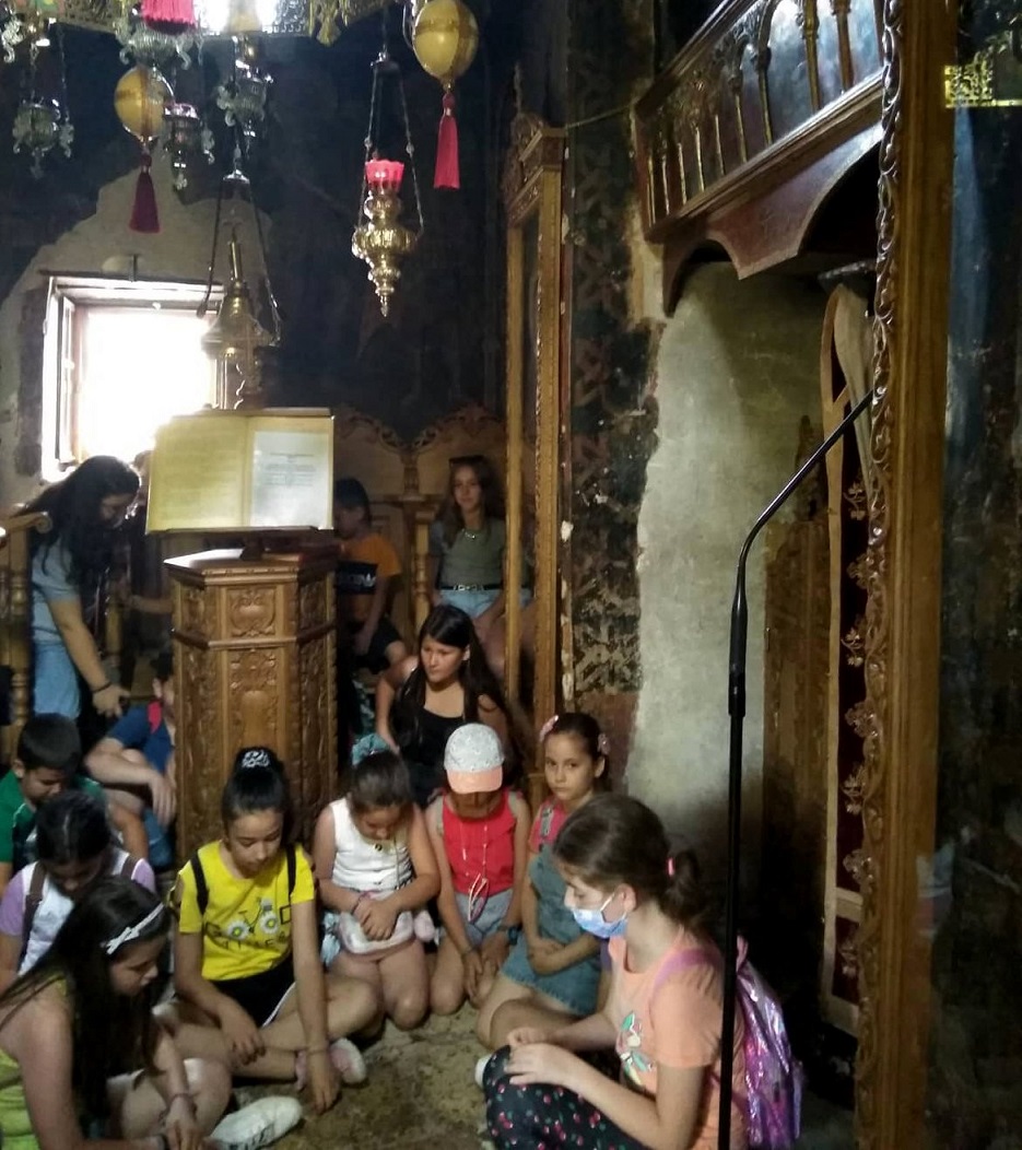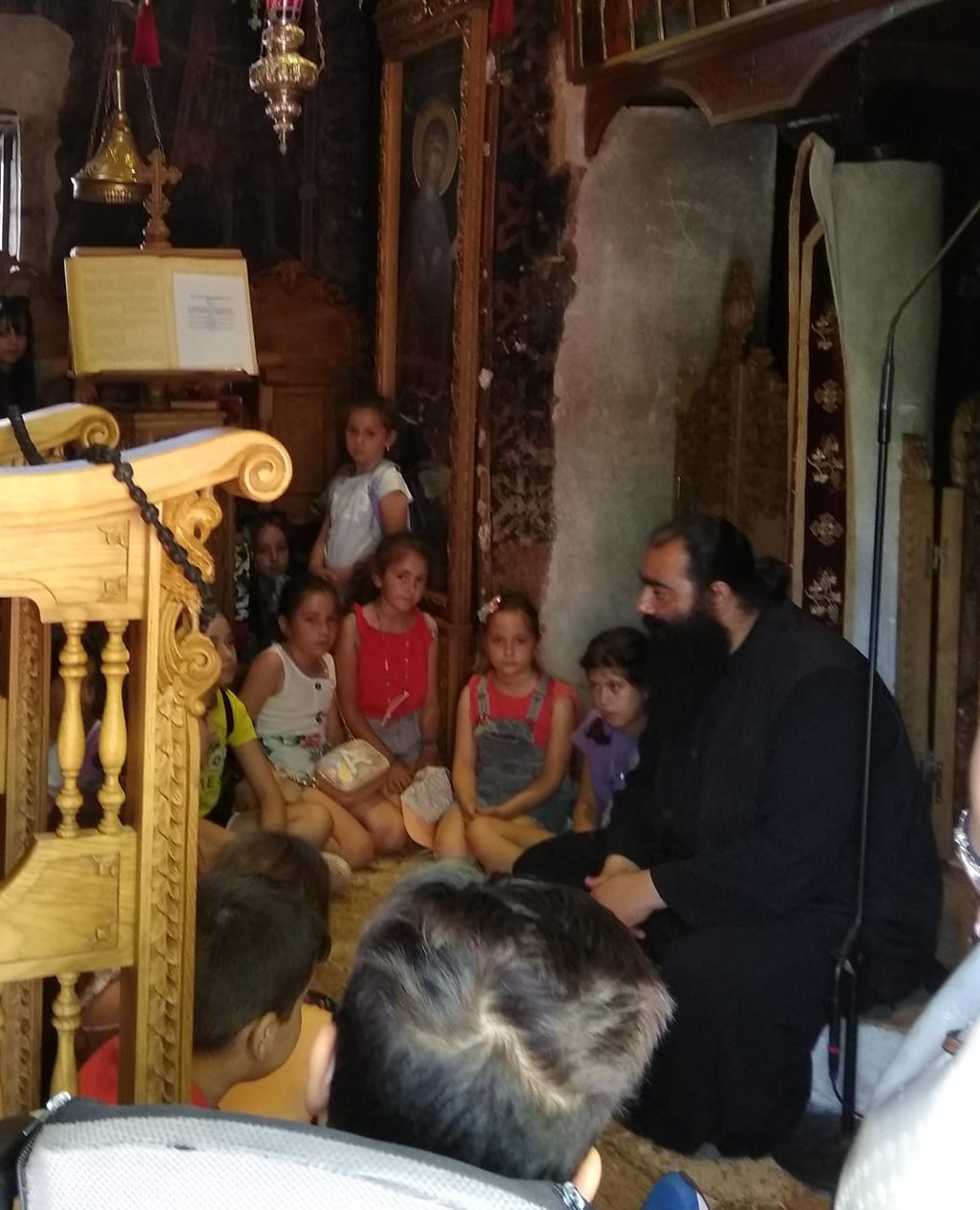 Αρχικά, σε μια όμορφη τοποθεσία πολύ κοντά στη λίμνη Τριχωνίδα, στο μέσο της διαδρομής από το Αγρίνιο προς το Θέρμο, επισκέφθηκαν την Ιερά Μονή Μυρτιάς, όπου τα παιδιά άκουσαν την ιστορία του μοναστηριού, από τον Ηγούμενο της Ιεράς Μονής και Αρχιμανδρίτη Ιωσήφ Ζωγράφο, ενώ κατέβηκαν και είδαν το εσωτερικό του κρυφού σχολειού, που σώζεται μέχρι σήμερα. Σήμερα το μοναστηριακό συγκρότημα περιβάλλεται από ψηλά κτήρια με κελιά και βοηθητικούς χώρους και στο κέντρο του βρίσκεται το καθολικό. Ο ναός έχει περάσει πολλές φάσεις μέχρι να λάβει τη σημερινή του μορφή.