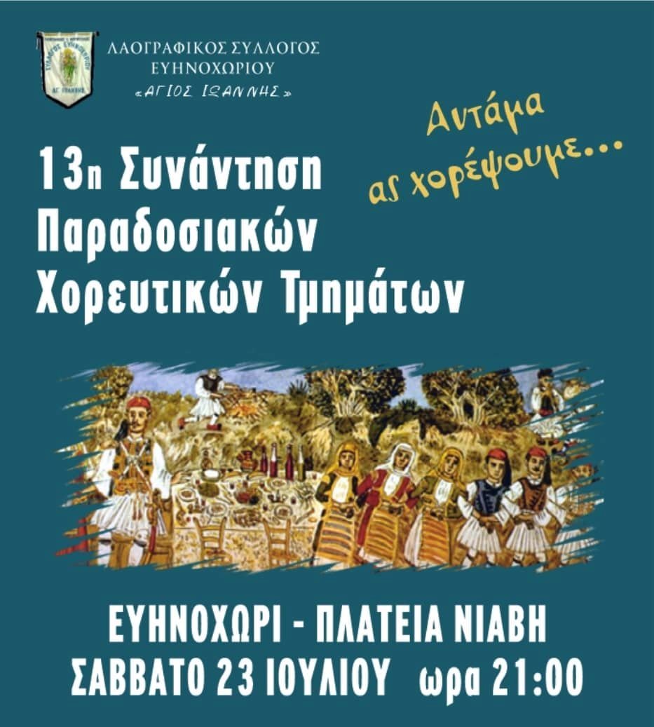 Αυλαία των καλοκαιρινών πολιτιστικών εκδηλώσεων για τον Λαογραφικό & Μορφωτικό Σύλλογο Ευηνοχωρίου "Άγιος Ιωάννης" με την 13η Συνάντηση Χορευτικών, η οποία θα γίνει το επόμενο Σάββατο 23 Ιουλίου στις 9:30 το βράδυ και θα συμμετάσχει η Μικτή Χορωδία Γυναικών Καλυβίων & Σταμνάς.