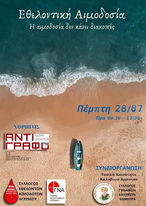 Εθελοντική Αιμοδοσία πραγματοποιείται την Πέμπτη 28 Ιουλίου στο Κοινοτικό Κατάστημα Καλυβίων Αγρινίου από τις 9:30 το πρωί έως τις 13:30 το μεσημέρι και η συμμετοχή όλων είναι σημαντική.