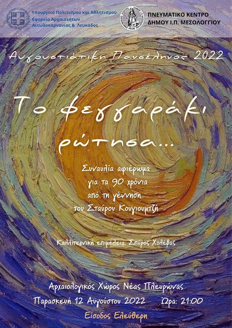 Η εκδήλωση αποτελεί ένα αφιέρωμα για τα 90 χρόνια από την γέννηση του Μικρασιατικής καταγωγής συνθέτη, Σταύρου Κουγιουμτζή, με τίτλο: «Το φεγγαράκι ρώτησε…» υπό τον μαέστρο Σπύρο Χολέβα.