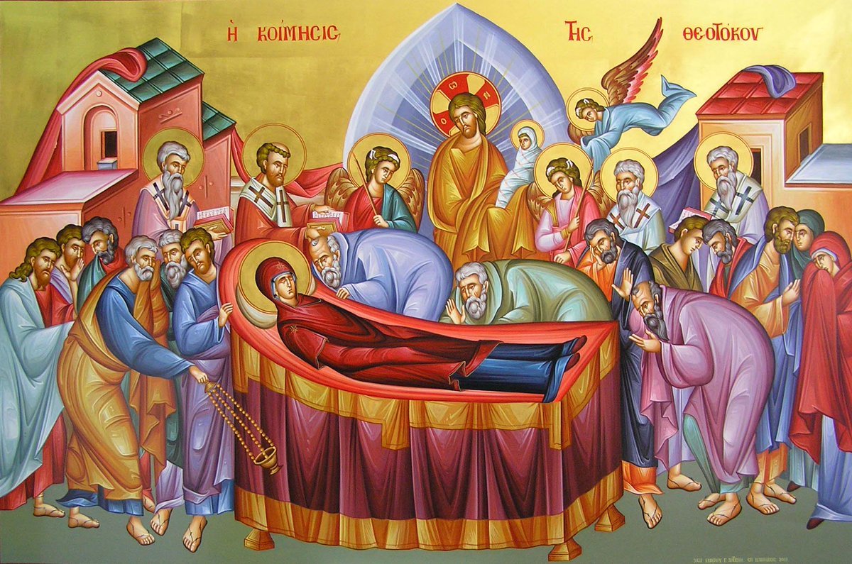 Ἔτσι, ἀπό τίς Παρακλήσεις τῶν πρώτων ἡμερῶν τοῦ Δεκαπενταυγούστου, πού ἐκφράζουμε στήν Παναγία ὅλους τούς καθημερινούς μας πόνους, ἀλλά καί τήν σημερινή ἡμέρα τῆς ἐνδόξου Κοιμήσεώς της, μαθαίνουμε στήν πράξη ὅτι ὁ θάνατος εἶναι θυμηδία καί χαρά, εἶναι ἕνας ἁπλός ὕπνος, ὅτι, δηλαδή, ὁ βραδυνός ὕπνος εἶναι ἕνας μικρός θάνατος, καί αὐτό πού ὀνομάζουμε θάνατο εἶναι ἕνας μεγάλος ὕπνος μέχρι τήν ἡμέρα τῆς ἀναστάσεως τῶν σωμάτων ὅλων τῶν ἀνθρώπων. Καί αὐτό τό πανηγυρίζουμε μέχρι τήν τελευταία ἡμέρα τοῦ Αὐγούστου.