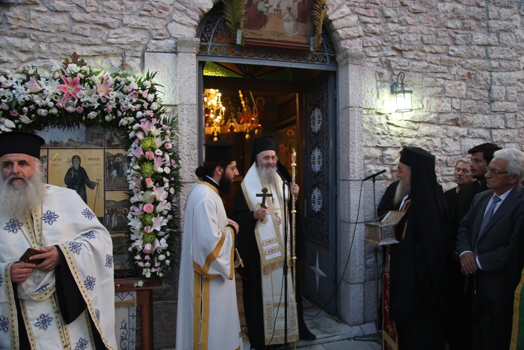 Πριν τον Εσπερινό, στα προπύλαια του Ιερού Ναού έγινε η υποδοχή της ιεράς Εικόνος και του ιερού Λειψάνου του Αγίου Κοσμά από την ομώνυμο Ιερά Μονή.