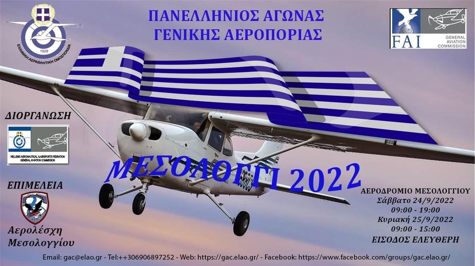 Ένα όμορφο αεροπορικό διήμερο πραγματοποιήθηκε στο Μεσολόγγι στις 24-25 Σεπτεμβρίου το οποίο έφεραν εις πέρας με μεγάλη οργανωτική επιτυχία τα μέλη της Αερολέσχης Μεσολογγίου, οι συντελεστές και οι συμμετέχοντες στον Πανελλήνιο Αγώνα πρωταθλήματος Γενικής Αεροπορίας 2022.