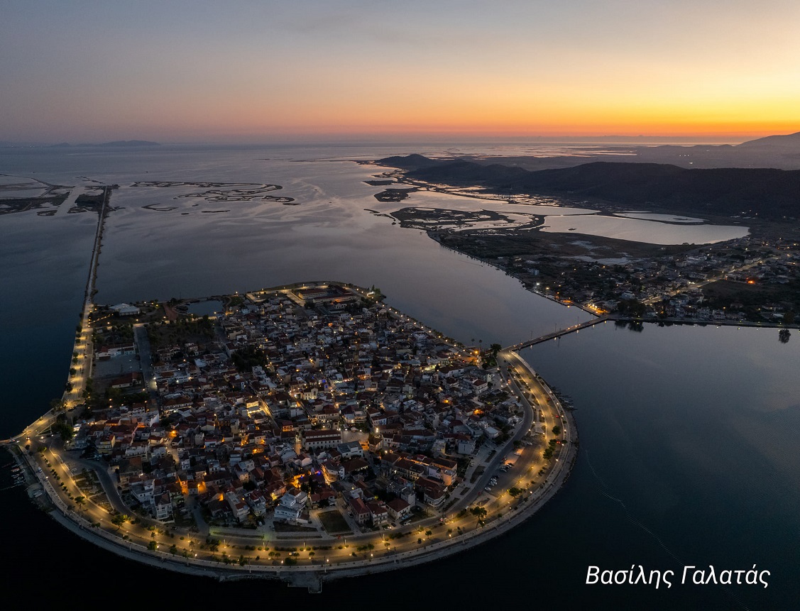 Μια πόλη κατάμεσα στη λιμνοθάλασσα αγκαλιά με το υγρό στοιχείο, που γεννάει ζωή. Γι’ αυτό η ζωή βουίζει ολόγυρά της, ψάρια, πουλιά και άνθρωποι απλοί του «δος ημίν σήμερον». Σπιτάκια χαμηλά και στενοσόκακα γεμάτα ¨καλημέρες¨! Φουφούδες που καπνίζουν δω κι εκεί, και κυράδες μεσόκοπες που σκύβουν πάνω τους «μ’ ευλάβεια». Ηλιοκαμένα πρόσωπα που πάνε κι έρχονται αλλάζοντας απλοϊκά αστεία, σε μια χαριτωμένη γλώσσα, με λέξεις μονοσύλλαβες...